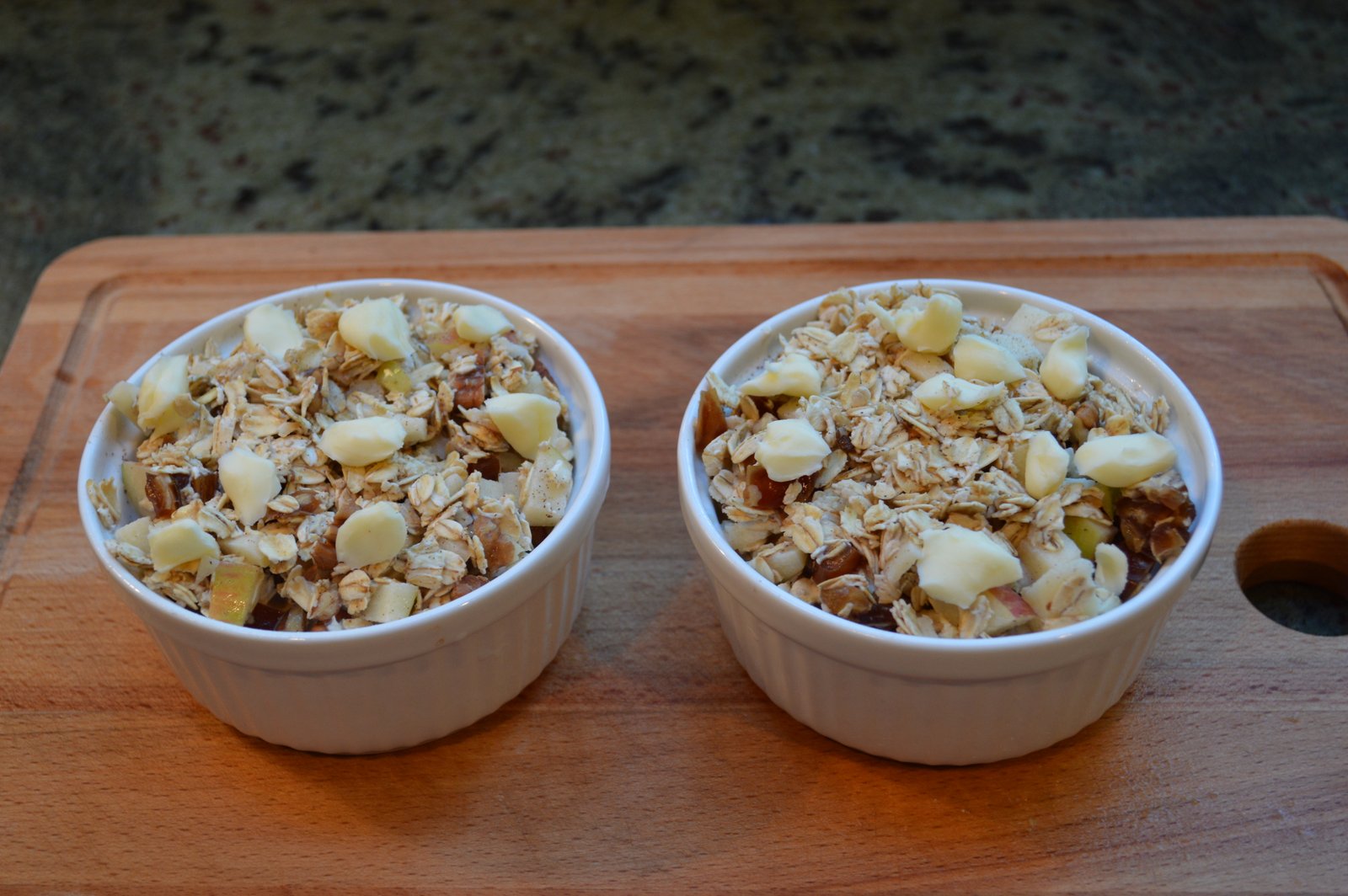 Preheat oven to 350 degrees. Spray two 10 oz. ramekins with cooking spray. In a small frying pan over medium-high heat, toast the pecans until fragrant and just beginning to brown, about 5 to 6 minutes. Remove and set aside. In a small bowl combine the oats, brown sugar, cinnamon, salt, fruit and pecans and mix well with a wooden spoon. Pour oat mixture into the prepared ramekins. Combine the milk and vanilla and then pour into the ramekins, dividing equally. Top each with a teaspoon of butter, broken into small pieces to dot the top. Bake the ramekins until completely set, about 30 minutes and tops have started to brown. Serve warm topped with whipped cream. Serves two.