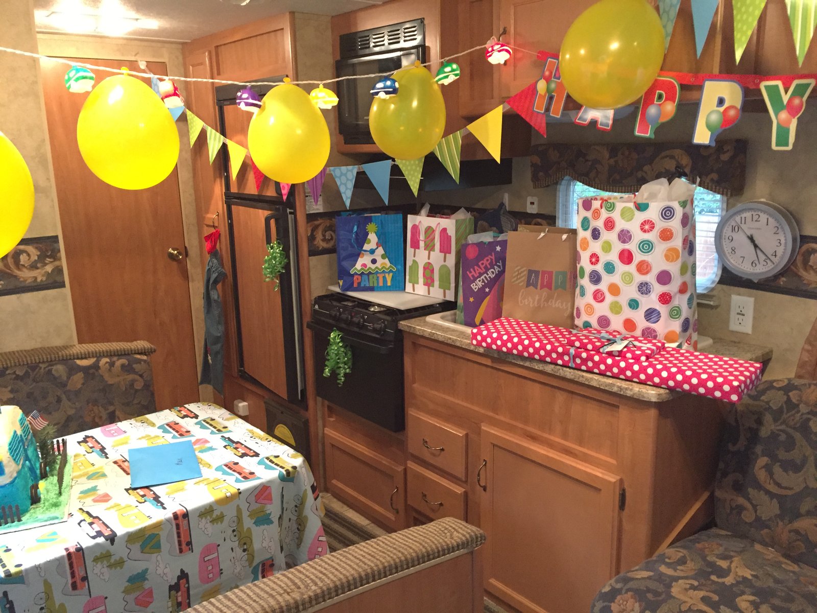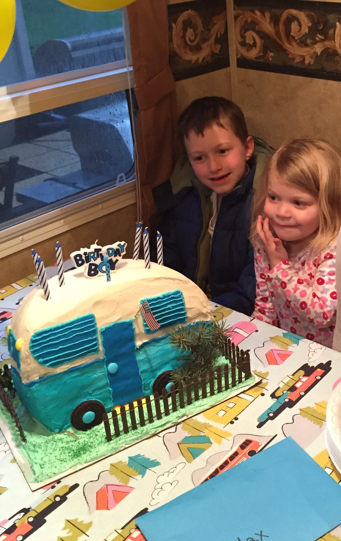 The whole famdamly, including the wet dog, crowded inside the trailer to watch Max blow out the candles on his cake and open his presents. He was just so excited - while he was waiting for everyone to squeeze in he said, "I can't believe I'm sitting at a U-shaped dinette!"
