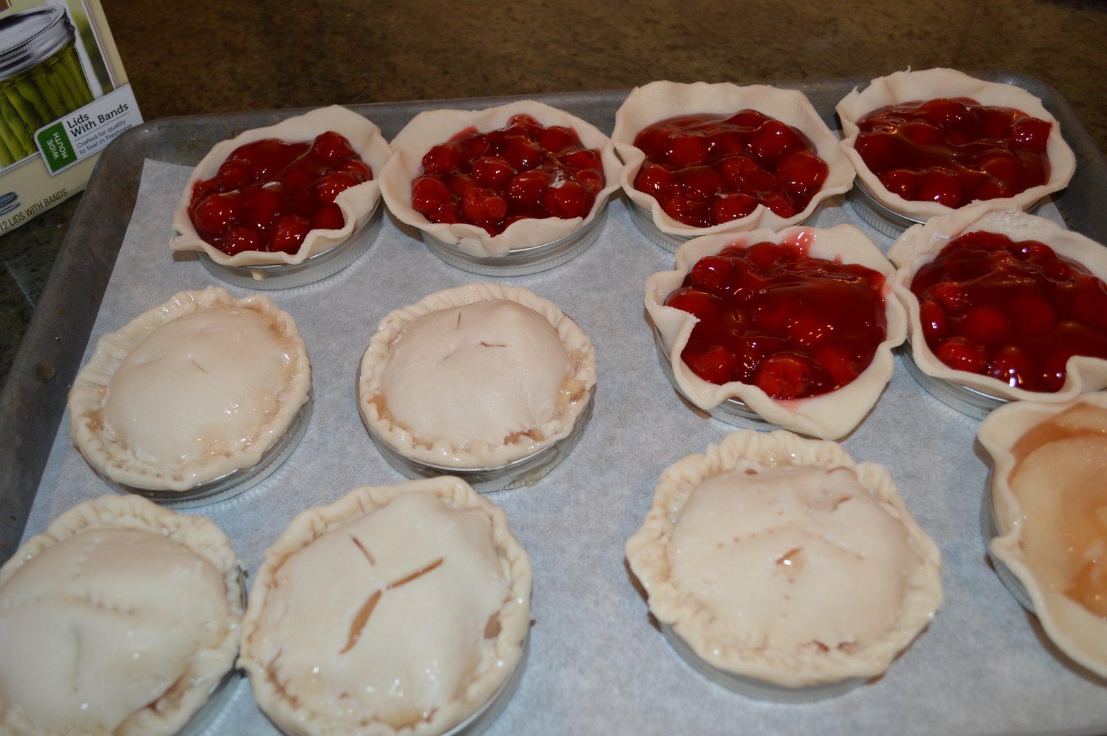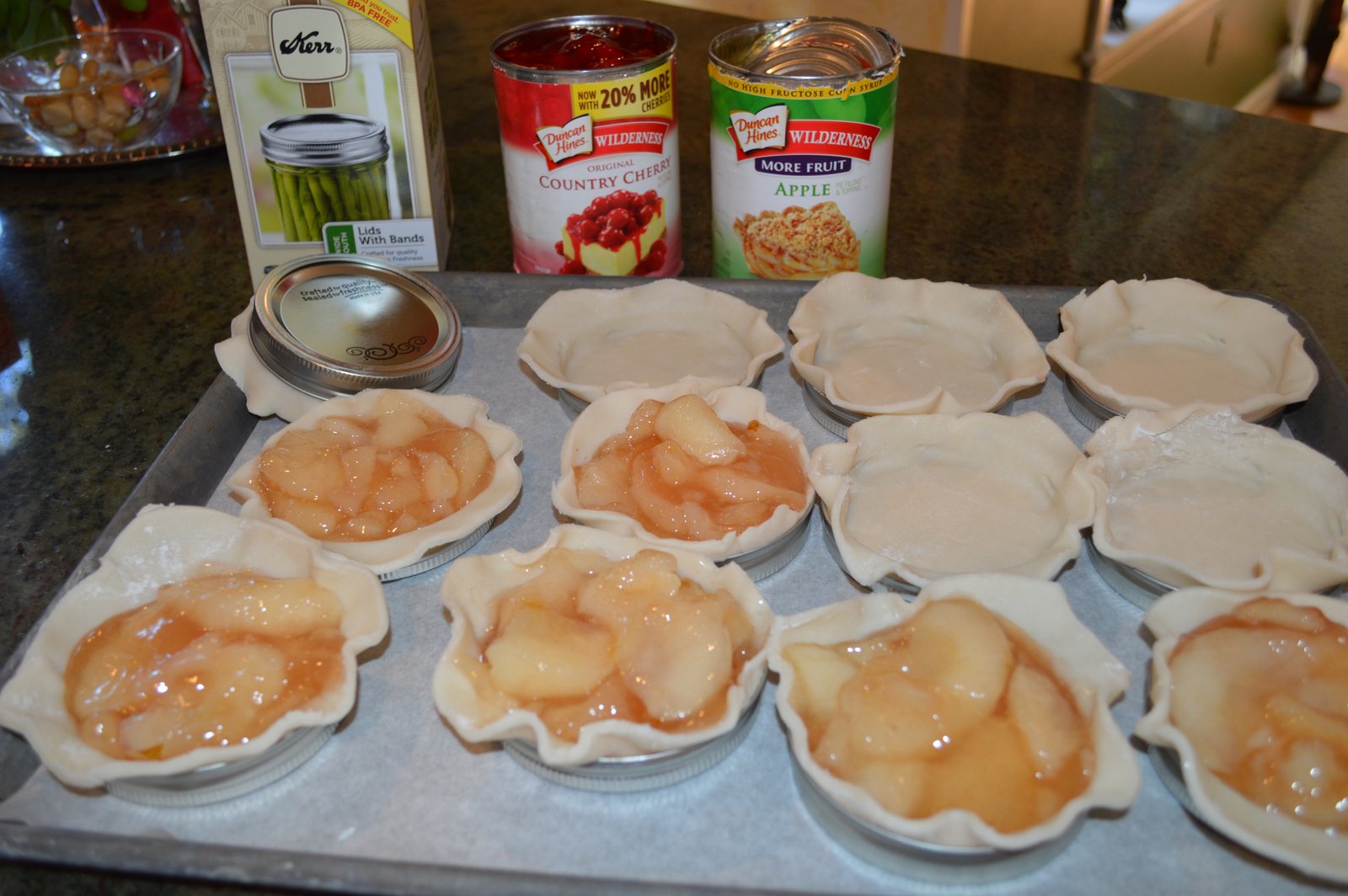 Quart size, Wide Mouth Mason Jar lids seemed to be just the right size, although you could use the smaller lids, totally up to you. Since I was short on time and truly wanted these to be a "cinch" to make, I used store-bought Pillsbury Pie Dough and canned pie filling. I used the lid as my guide and cut circles 1-inch larger, then fit them into the lid and they were ready to be filled. Could not have been easier. Store bought filling came next, I spooned it into the pie shell in a matter of minutes. So far, so good! Next I cut the tops for the pies, but you could cut strips and make a lattice top, I just cut large circles, again 1-inch larger than the lid. Once they were placed on top, I pinched the edges all around, cut slits in the top of the pies and brushed them with an egg wash. So far I was about 8 minutes into my pie making. 8 minutes!!! I was almost giddy!