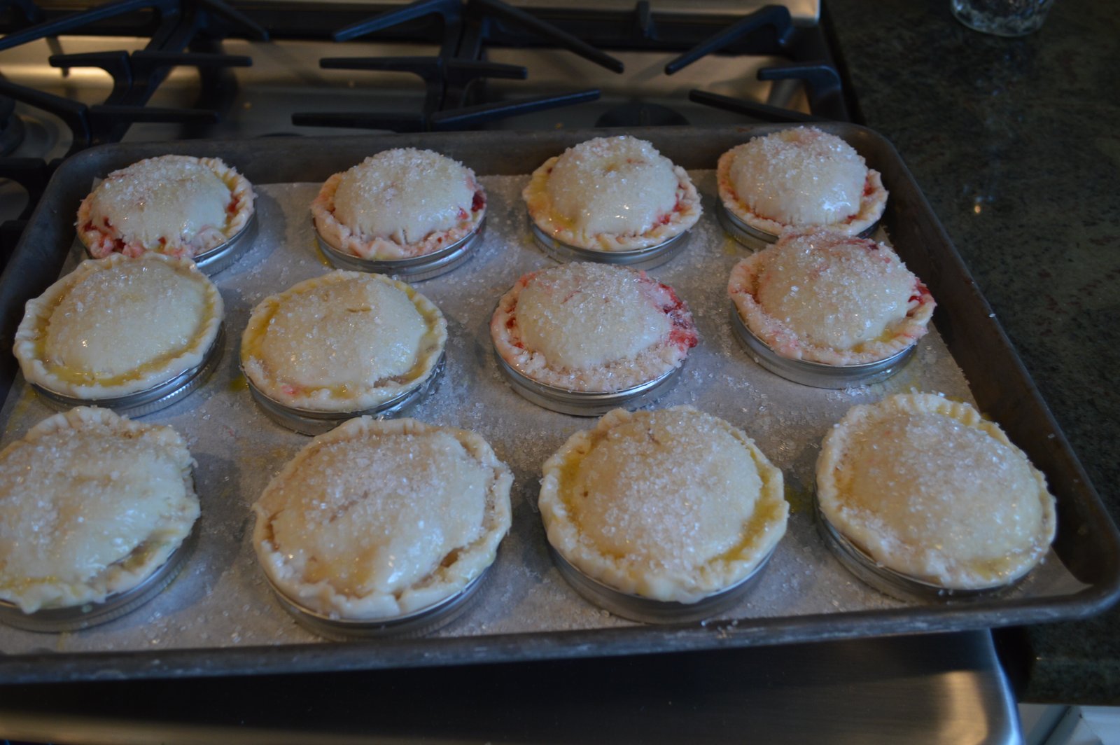 Sprinkling coarse sugar on top of the pies made them pretty and then they were ready to be baked. 20 minutes later, the pies were a light golden brown on top with bubbly juices. Done! They were a cinch to make! I let the pies cool for about 10 minutes, until I could handle them without getting burned. I was a bit worried about how to remove them from the lids - but that proved to be a non-issue...they popped right out!