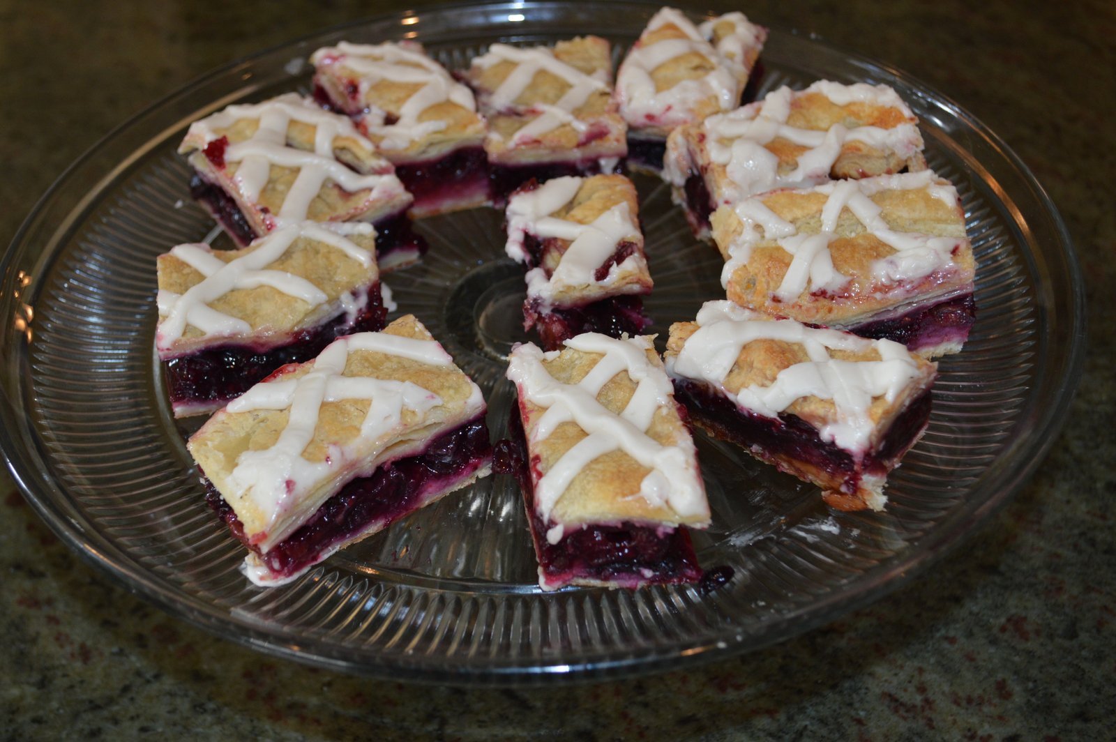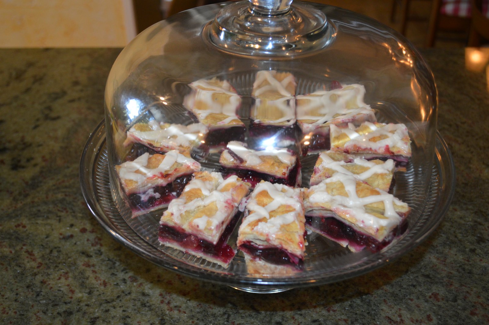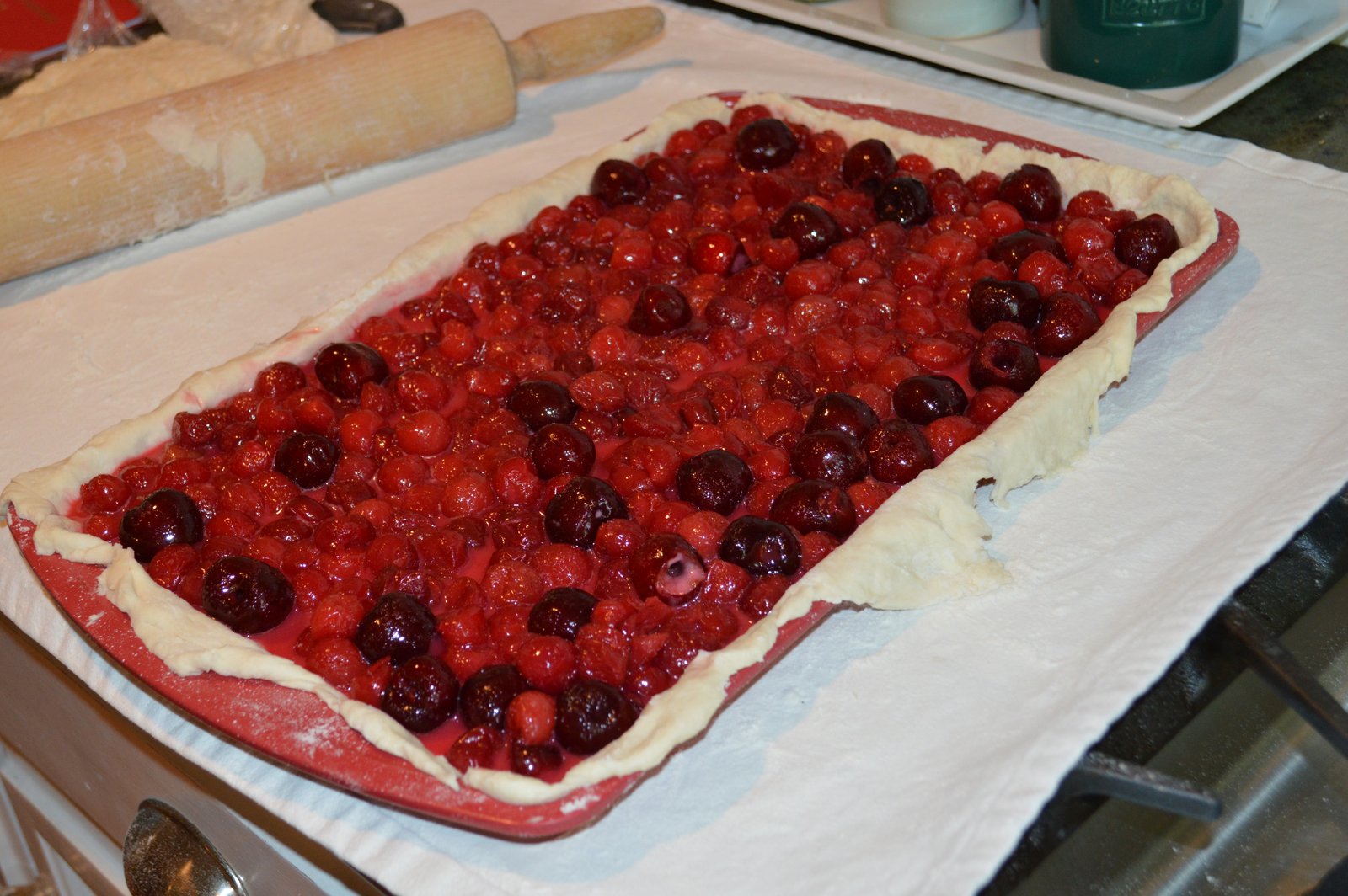 This isn't an overly sweet pie. It's made with frozen pie cherries with some fresh Bing cherries mixed in. You can also add in any other berry you like. I've made it with cherries, raspberries and blueberries and it was delish. Whatever makes your berries merry - mix 'em up! I also used purchased refrigerated pie dough, which makes quick to assemble. You will need a 15x10x1-inch jelly-roll pan, which makes cutting the pie and getting a slice out super easy.