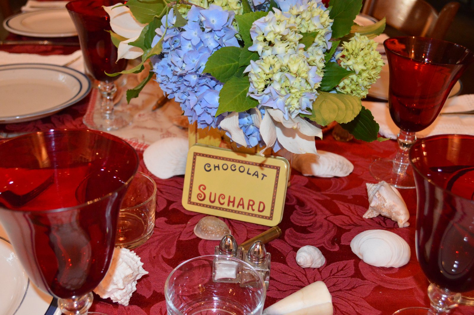 The table was set with France in mind...blue, red and white. Notice the centerpiece? It's a metal WWII Ammo box - the mister and I found it in an antique shop! I scrubbed it with bleach, washed it clean, lined it with red and white checked fabric and then filled it with baguettes.