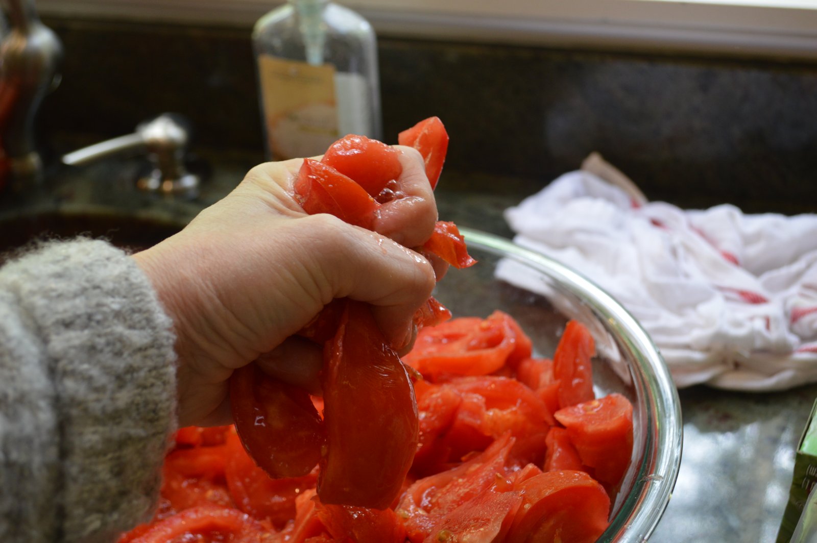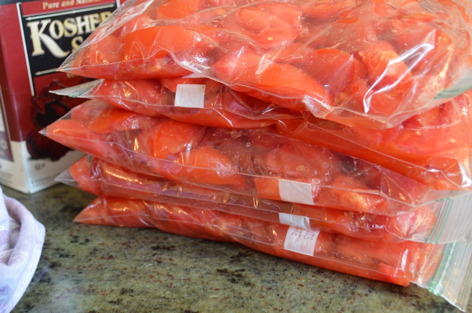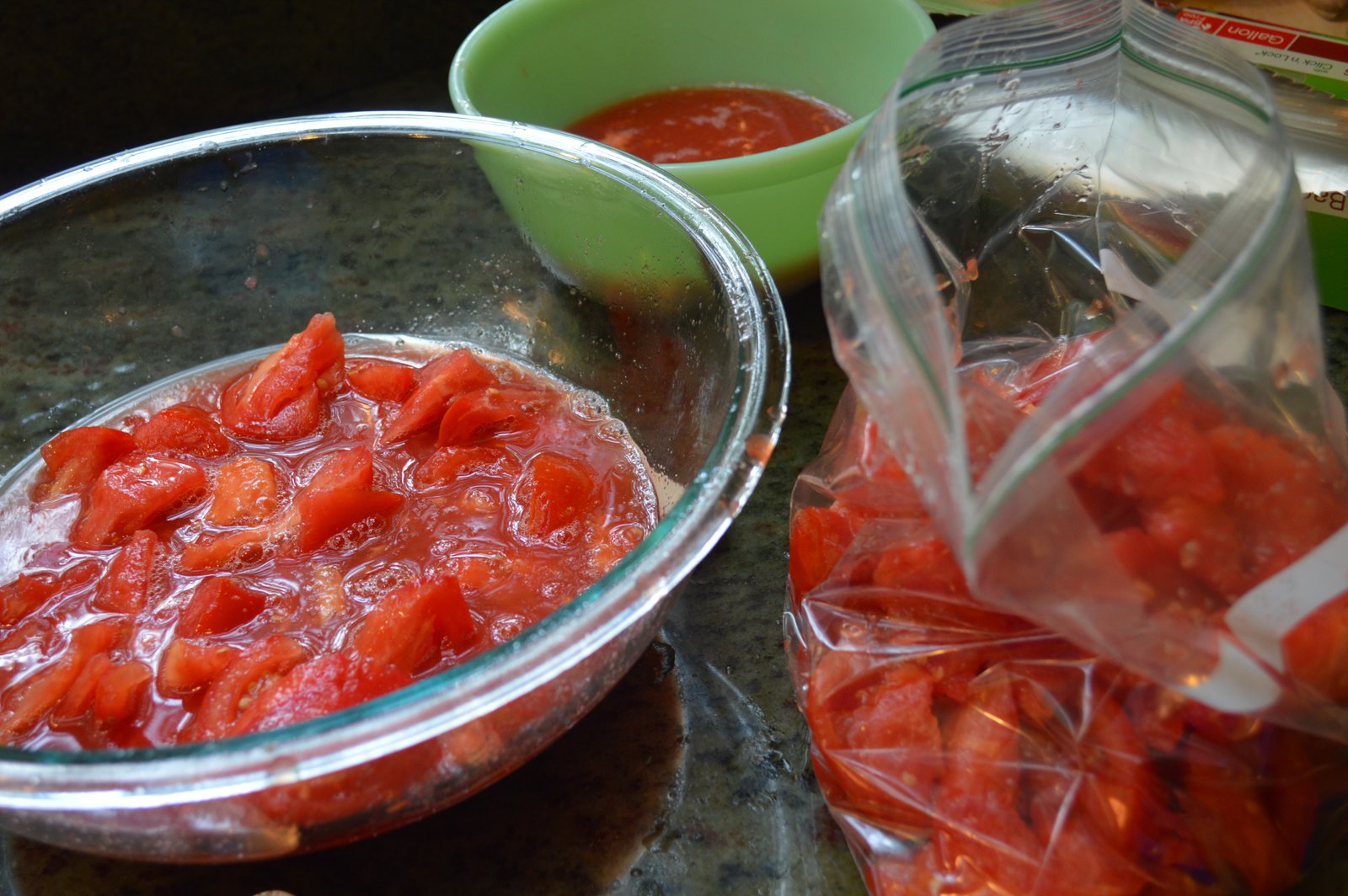 After I cored and sliced my tomatoes into chunks, I squeeze out some of the juice/seeds with my hand into a bowl and then put the tomato pulp into freezer bags. (I didn't squeeze very hard, just tried to get rid of a bit of the liquid, not all of it.) I added 1 1/2 teaspoons salt and 1 teaspoon sugar to each gallon-size freezer bag, mixed it together, closed the bag and that's the whole process!