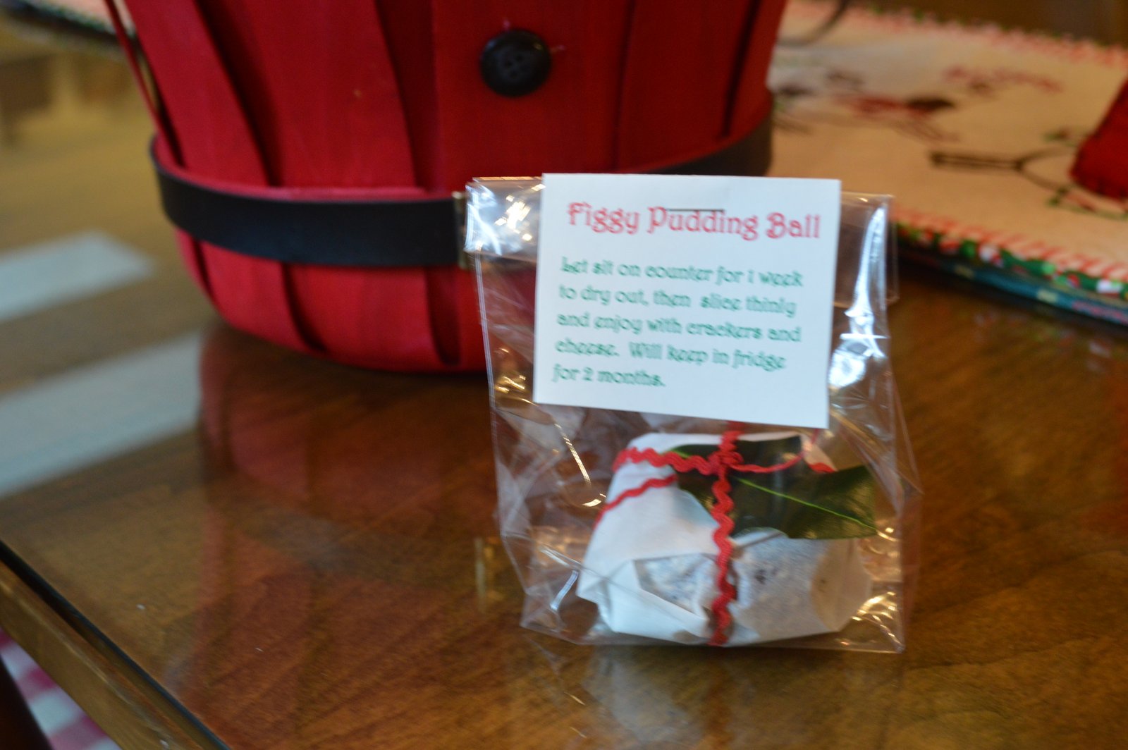 Since I was giving this batch of Figgy Pudding Balls to friends the day I made them, I needed to attach a little tag telling them to let the ball sit on their counter to firm up a bit before they cut into it. Although it's not really necessary...if you cut into it the day it's made or the next day, it's a bit sticky, but still very delicious.