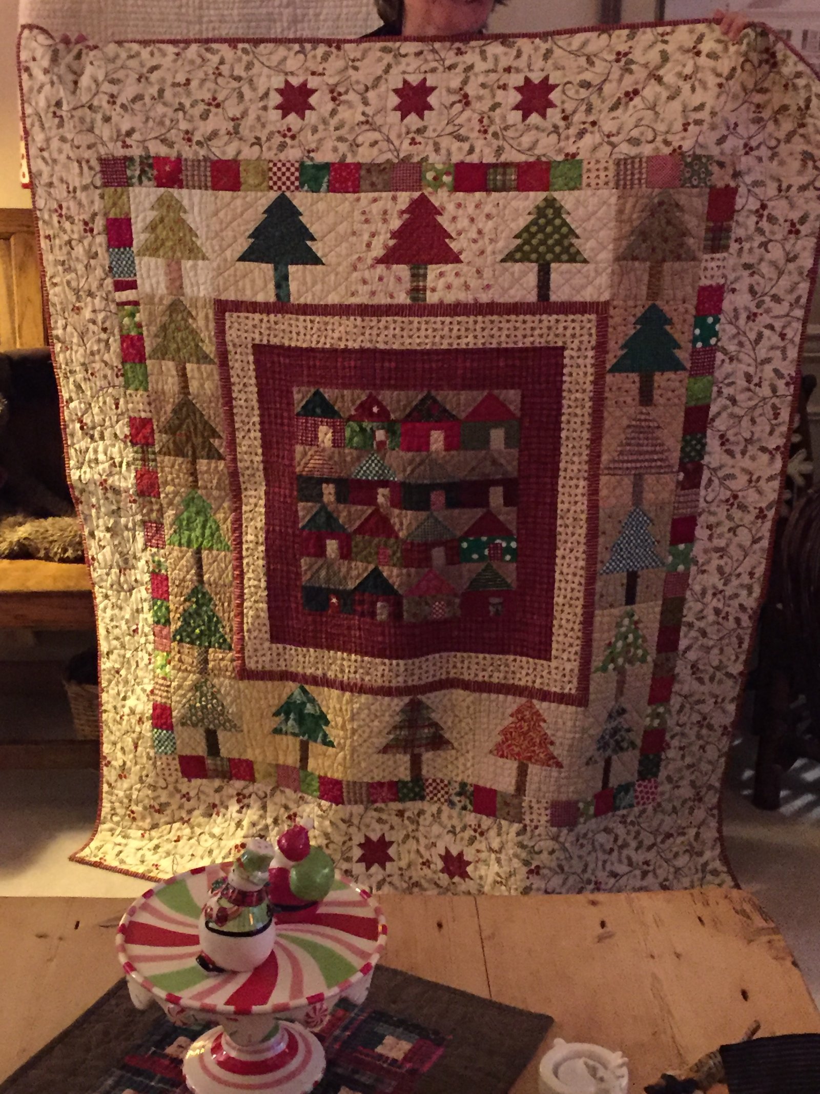 This quilt was made by Barbara...just turn your head, give your neck a stretch! Notice the big Santa panel in the quilt? So cute! And then notice the background "tree" fabric between the row with the houses - very clever, no? Barbara made a quilt just like this for our gift exchange a year ago and she decided she wanted one for herself so she made another!
