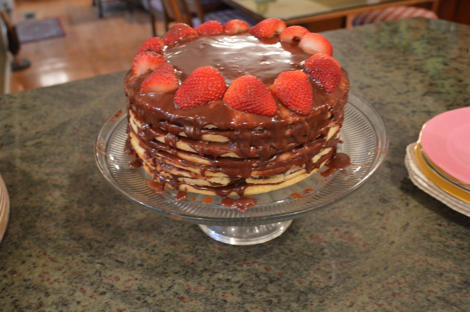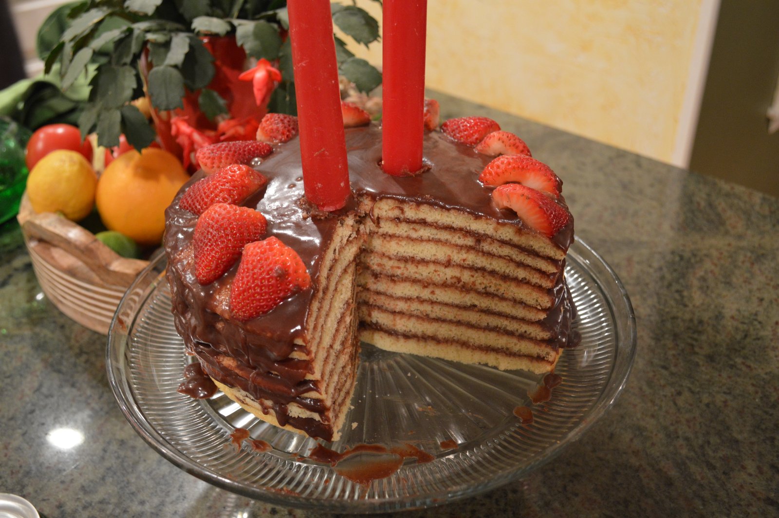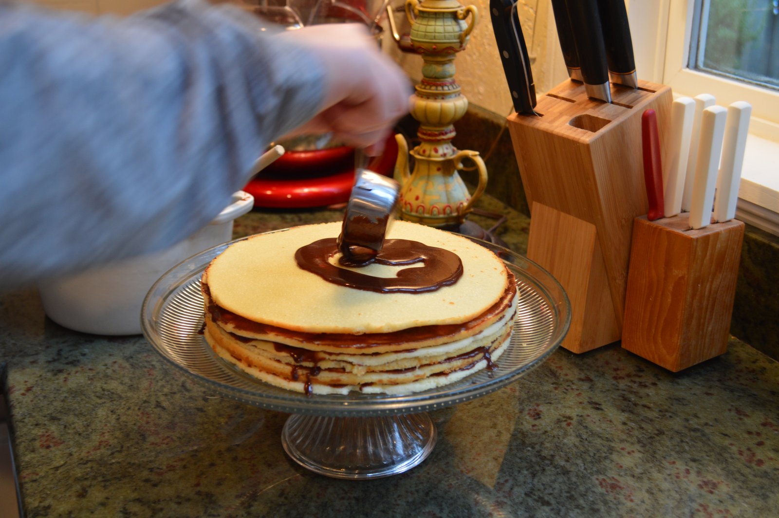 There isn't a short-cut when it comes to baking the layers - you'll just have to spend the time. If you baked one or two larger layers and then tried to cut them into smaller ones, you would end up with a crumbly mess and the layers wouldn't have the right texture, being just a teensy-bit crisp on the outside while spongy-soft on the inside. So don't waste your time trying that - it won't work and it won't taste the same. 'Nuff said!