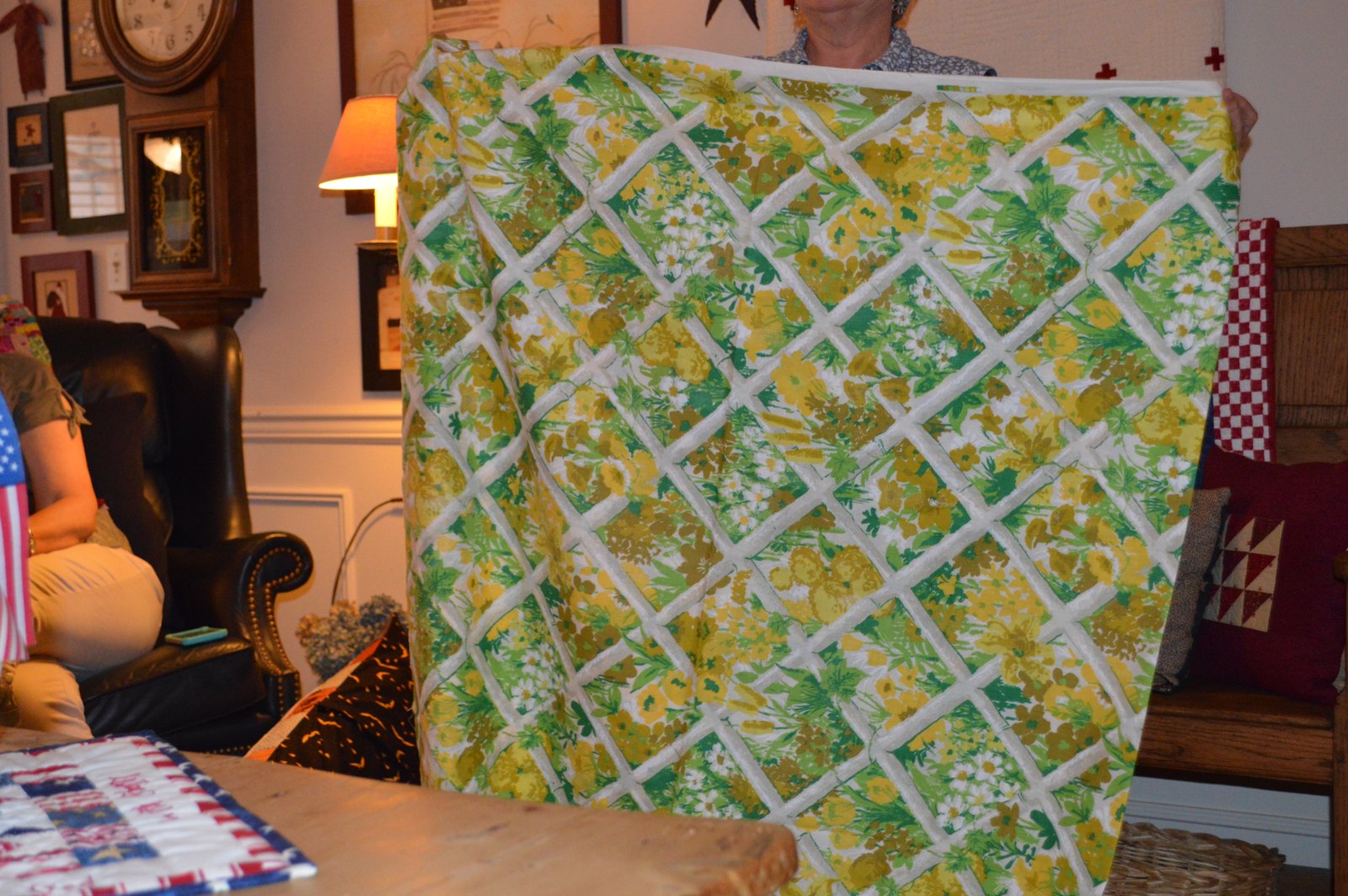 This green and yellow 9-patch is another one from Stephanie and below you can see the backing she found for this quilt - at Value Village - she finds the best deals! Stephanie couldn't have found a better match in a quilt shop! (Due to technical difficulties with my brain I was not able to post the correct picture where I wanted it...so look down to see the green and yellow backing, which is ONE fabric, it looks pieced but it's not!
