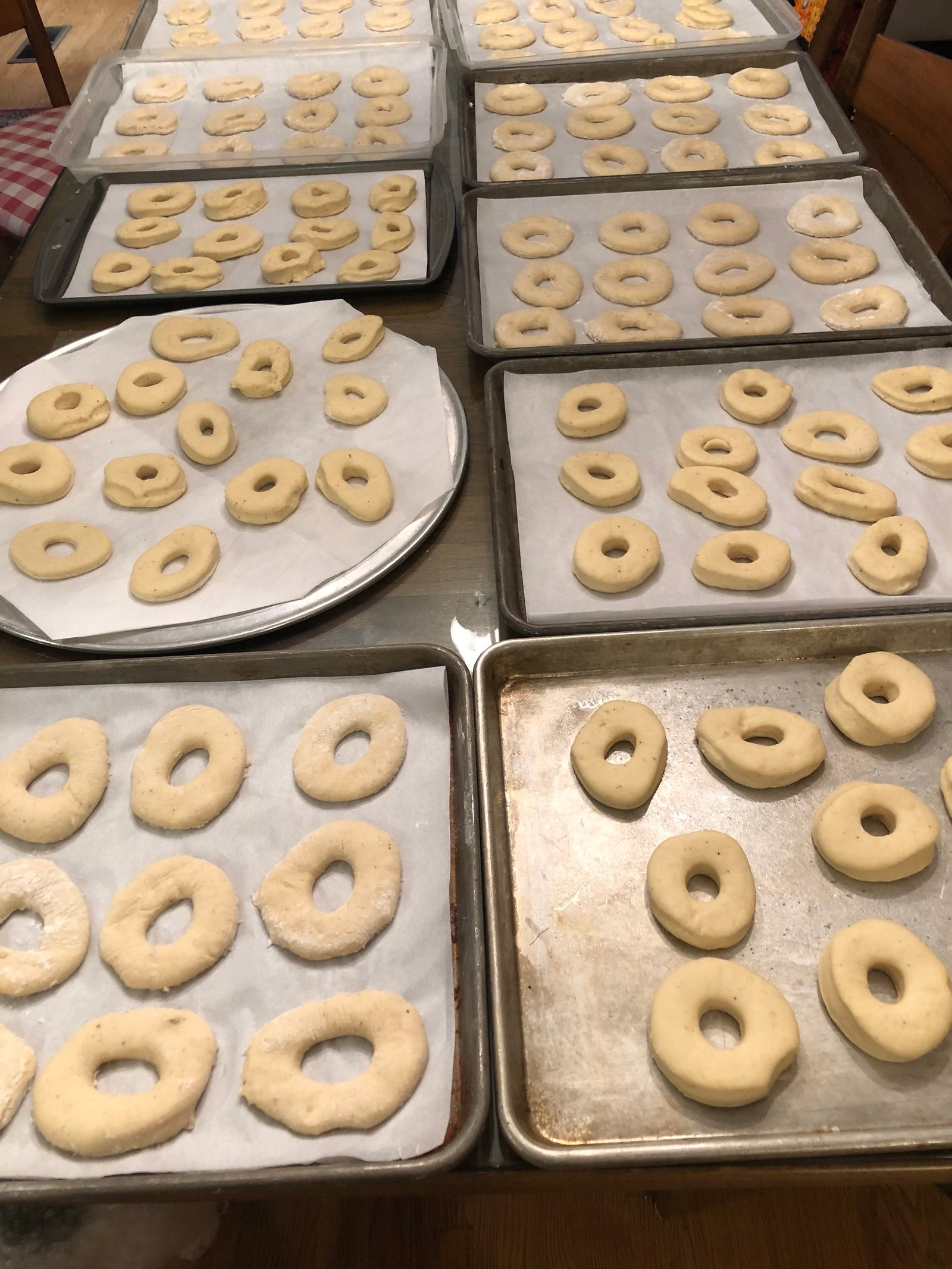 On a well-floured surface, roll out dough to 3/8-inch thick. Cut out dough using a 2 1/2-inch donut cutter. Set on floured baking sheet, cover lightly with a tea towel, and let rise for 30 minutes.