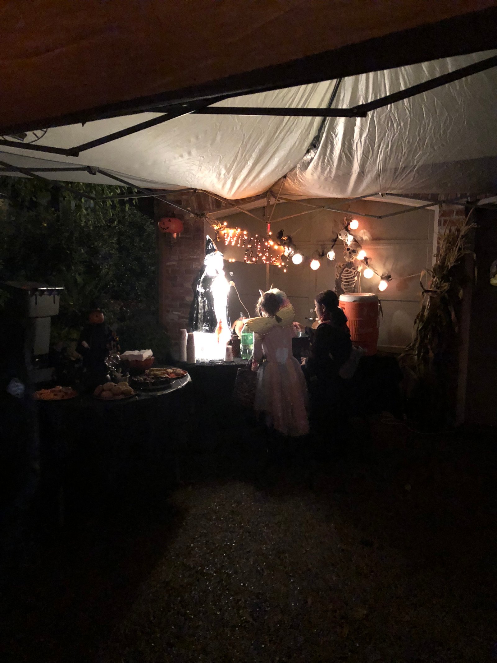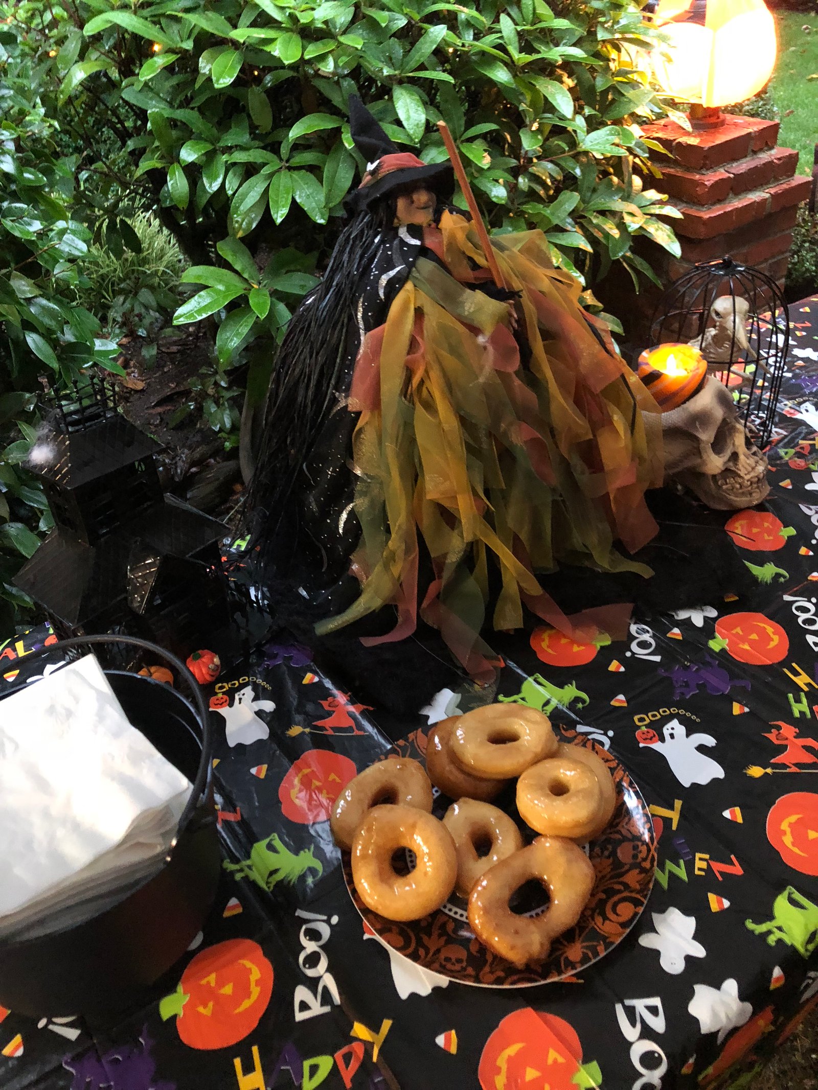A donut party also requires a really great donut recipe...which you will find below...and as many trays as you can find! And a big table to let them await their demise upon...and a garage, and 4 tents...if your garage is big enough and clean enough you can skip the tents but since ours was neither, we covered our driveway with them. You might be wondering why we did this outside or even did it at all (I'm now wondering that!) For years and years Tami Bean and her family hosted donut parties in their garage on Halloween night and it was a highlight for our community! Hundreds of people would go; they feasted on her delicious donuts and left with happy faces smeared with glaze and the hopes of donuts again the next year. Tami and her family moved away over the summer and I just felt like her donut tradition must continue!!! Something so great as donut night just could not die! So I tried to make Tami proud, I sent out Evites, put up decorations and I channeled her and used her recipe and she helped me by texting me tips and encouragement and while I might not have achieved Donut Master status, I do think our little party turned out okay, mainly because her donuts are just dang good. 5 dangs good!! Thank you Tami!!