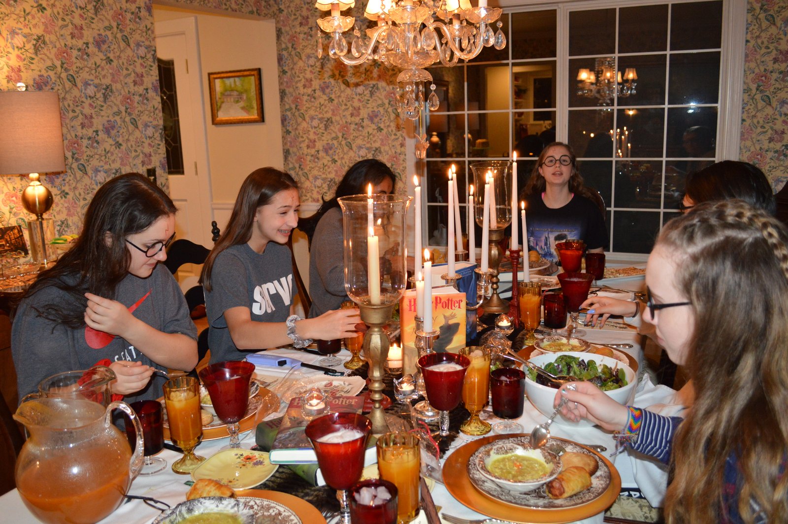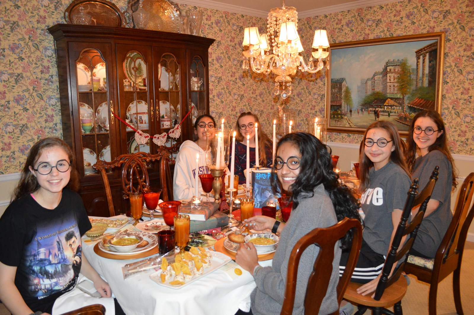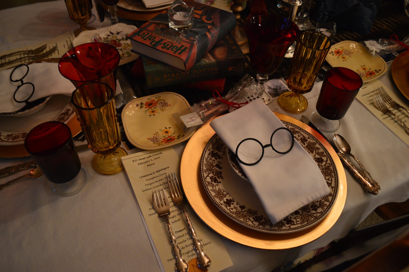 Before the tattoos were applied to each forehead and the glasses were placed in the proper position on the bridge of the nose, my guests had to help prepare the food...a Harry Potter cooking class of sorts. Things went well, only one band-aid was needed and nothing was broken! The feast was enjoyed by all, finished with complaints of being too full...yet they all had room for dessert!