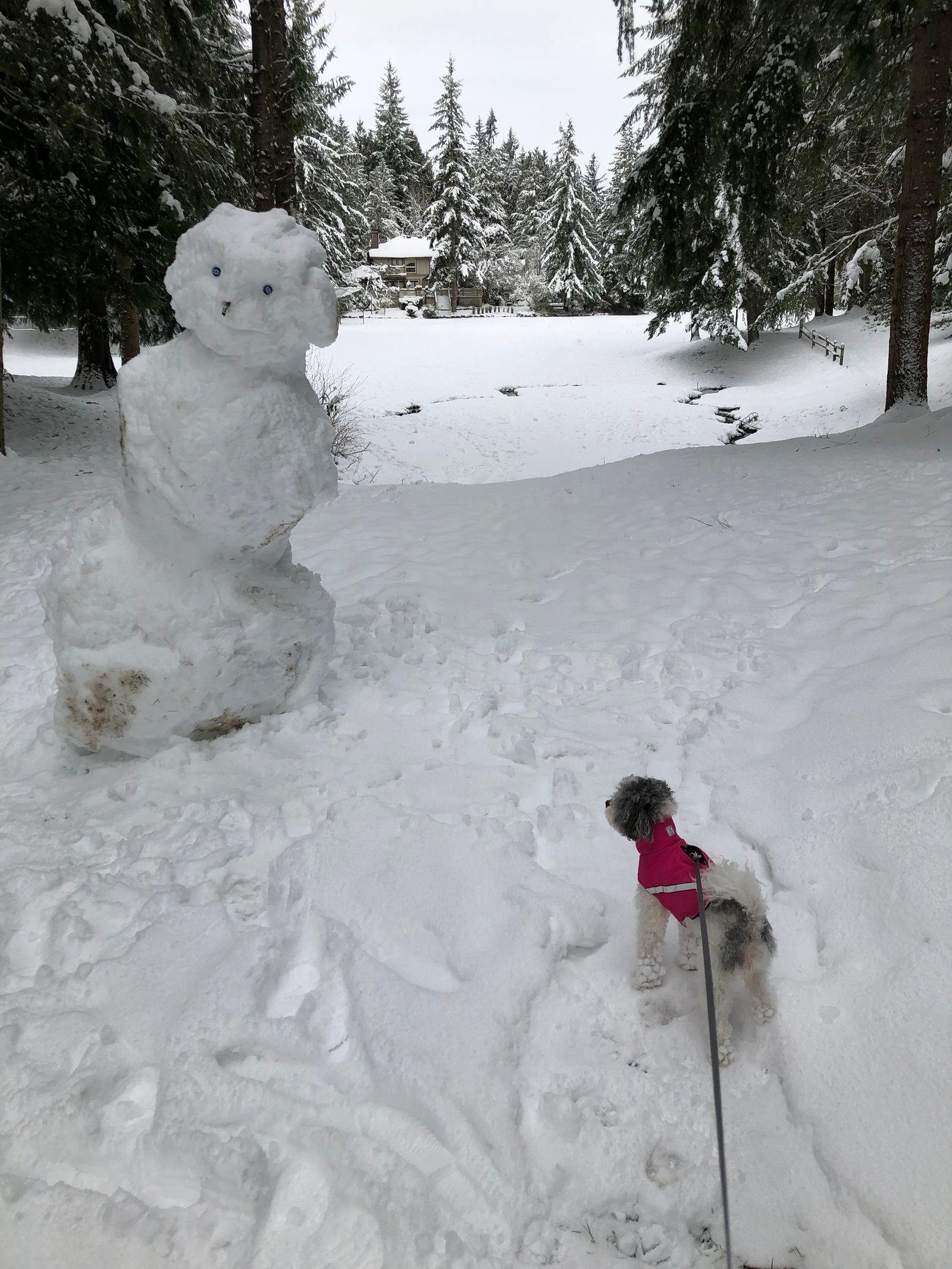 Every day there have been loads of kids sledding in the park behind our house - it's been so fun to watch. Snow "forts" were built, destroyed and then built again and there were several snowmen, too...like this one Rosie is checking out...he's a bit of a leaner!