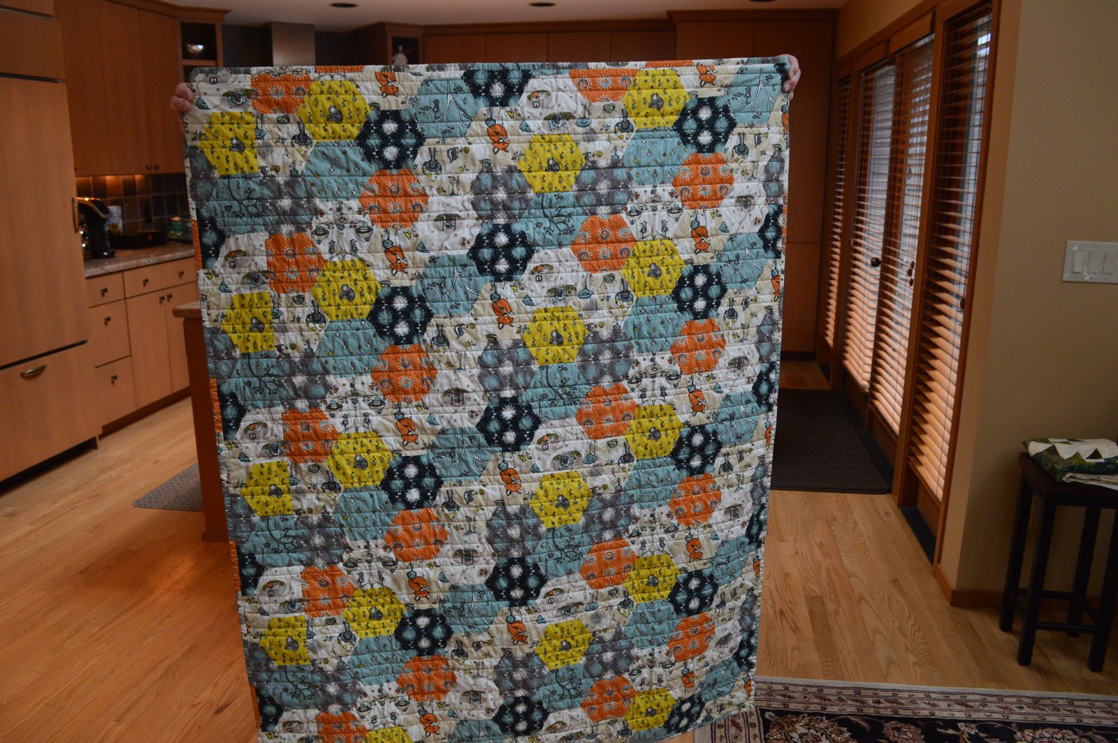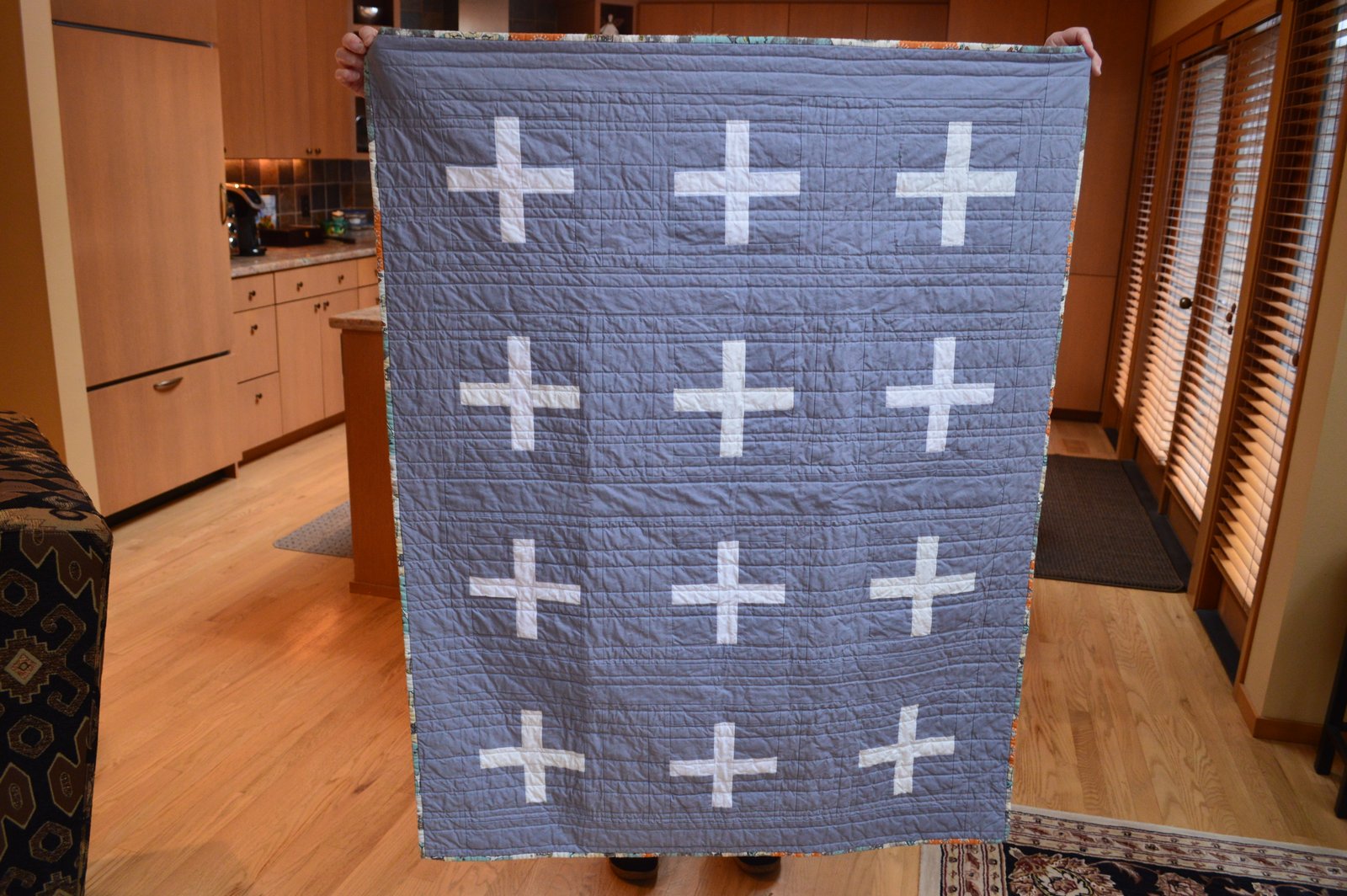 Stephanie's baby "plus" quilt is all finished and looking so nice! The straight-line quilting really adds to the modern look of this quilt - the backing is bright and happy; it's the perfect marriage of "baby sleep and baby wake".