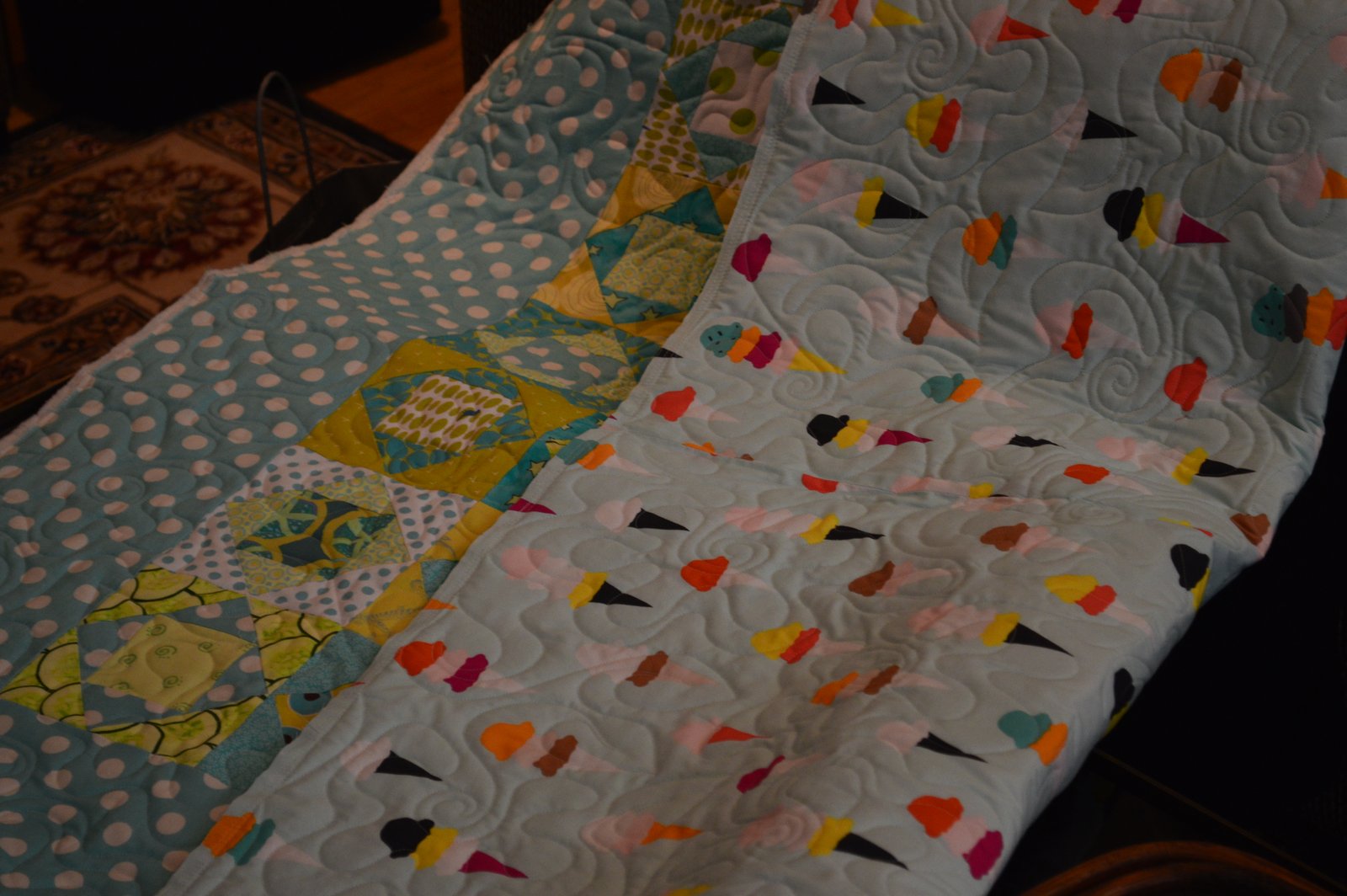 Check out the backing on Helen's quilt - ice cream cones! So fun and cute! Can you imagine being a new mom and having someone give you a gift like this?!?! I was given a hand-made quilt when my daughter was born and we used that quilt for years and years and I still have it! It's barely held together because it was loved almost to pieces!
