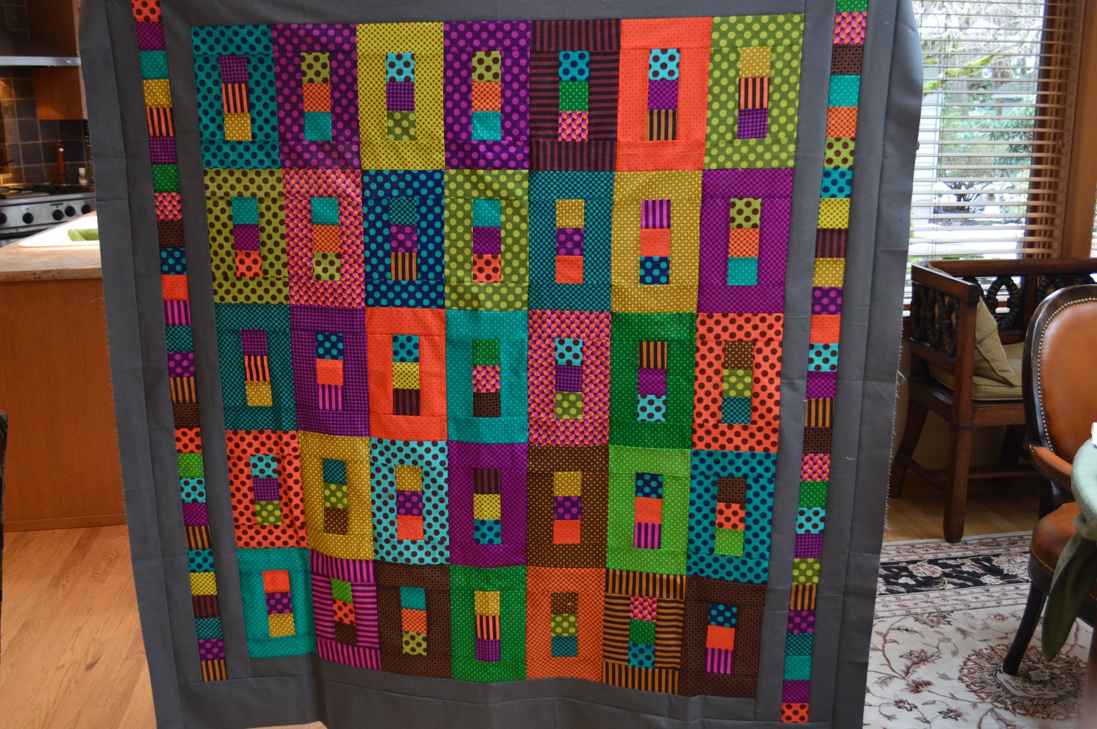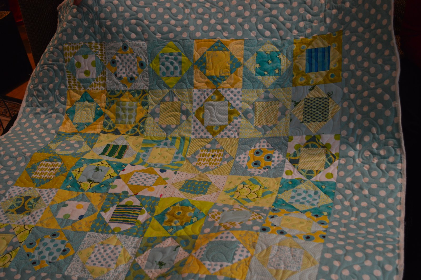 This very sweet baby quilt was made by Helen - the queen of simple blocks with FUN fabrics! I wrote down in my notes that this was a green baby quilt...looks very blue to me here but I do think the colors might be off a bit! Maybe it's time I invested in a new camera?!?