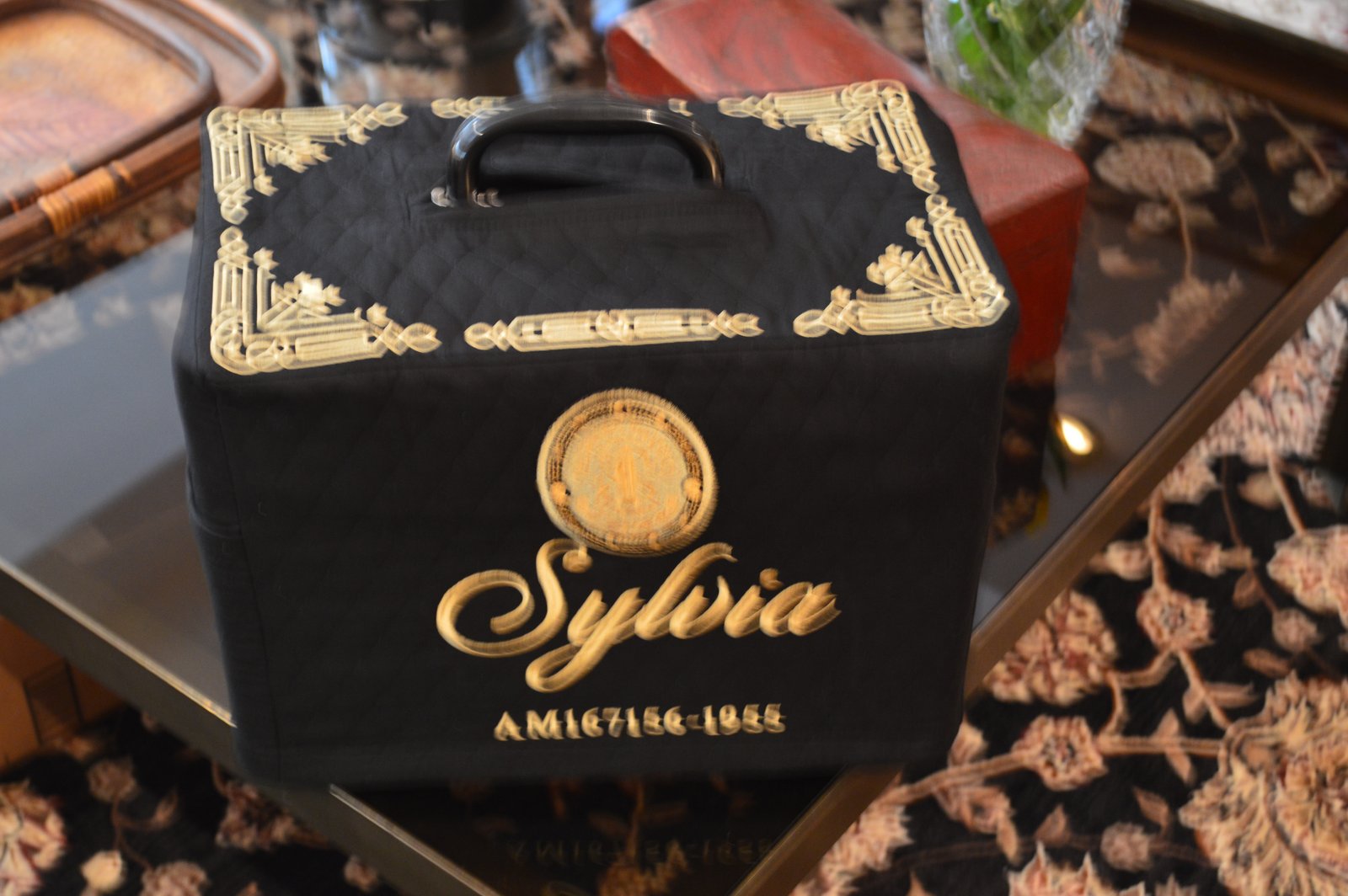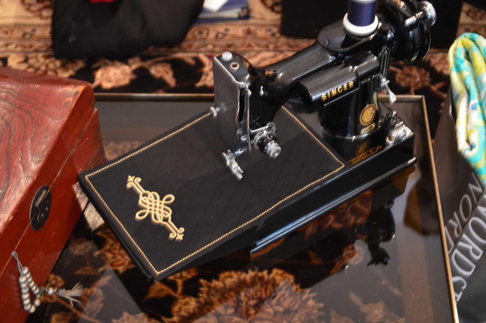 I'll blame this picture on the camera and not the photographer because there is NO way I caused that!!!! Maybe I was doing a happy dance because I love this cover so much! It fits nice and snug over the Featherweight - and that's the Singer decal stitched above the name! Sorry it's so blurry but you get the idea, right? If you want to have a cover made for your Featherweight, check out Andrea's Custom Featherweight Covers on Facebook. Even if you don't want to have a cover made - just go look and see what Andrea does - Ahhhhhmazing!
