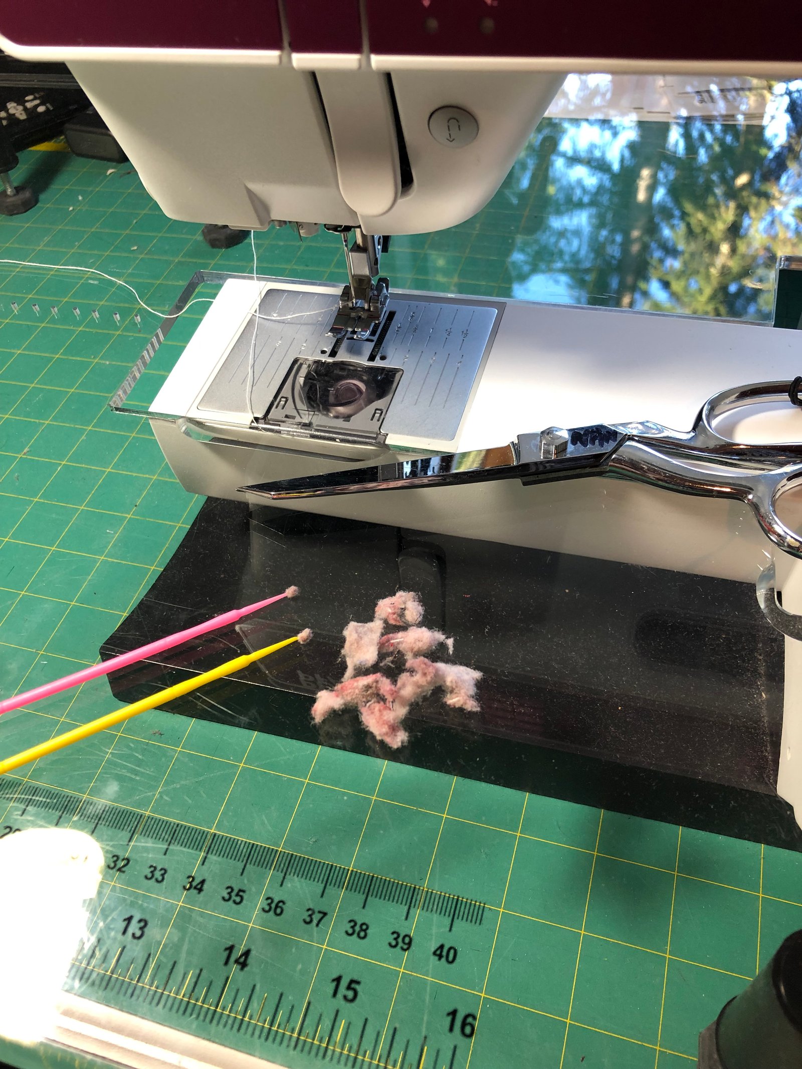 Let's start with a little house-cleaning, I mean machine-cleaning...I don't have time to clean my house! See those little pink and yellow sticks? They have a tiny little ball on the end that will grab and hold onto the smallest pieces of lint that your machine collects. Janet gave them to us at one of our meetings and I finally got around to using them - as you can see, they collected what is surely a mole-hill of lint! And all of that came just from under my bobbin carriage!! That's what happens when you finally get back to quilting in a serious way - I've machine quilted 2 quilts and pieced 3 tops in the last month - it's good to be baaaaaack! Now let me show you what my friends have been up to!