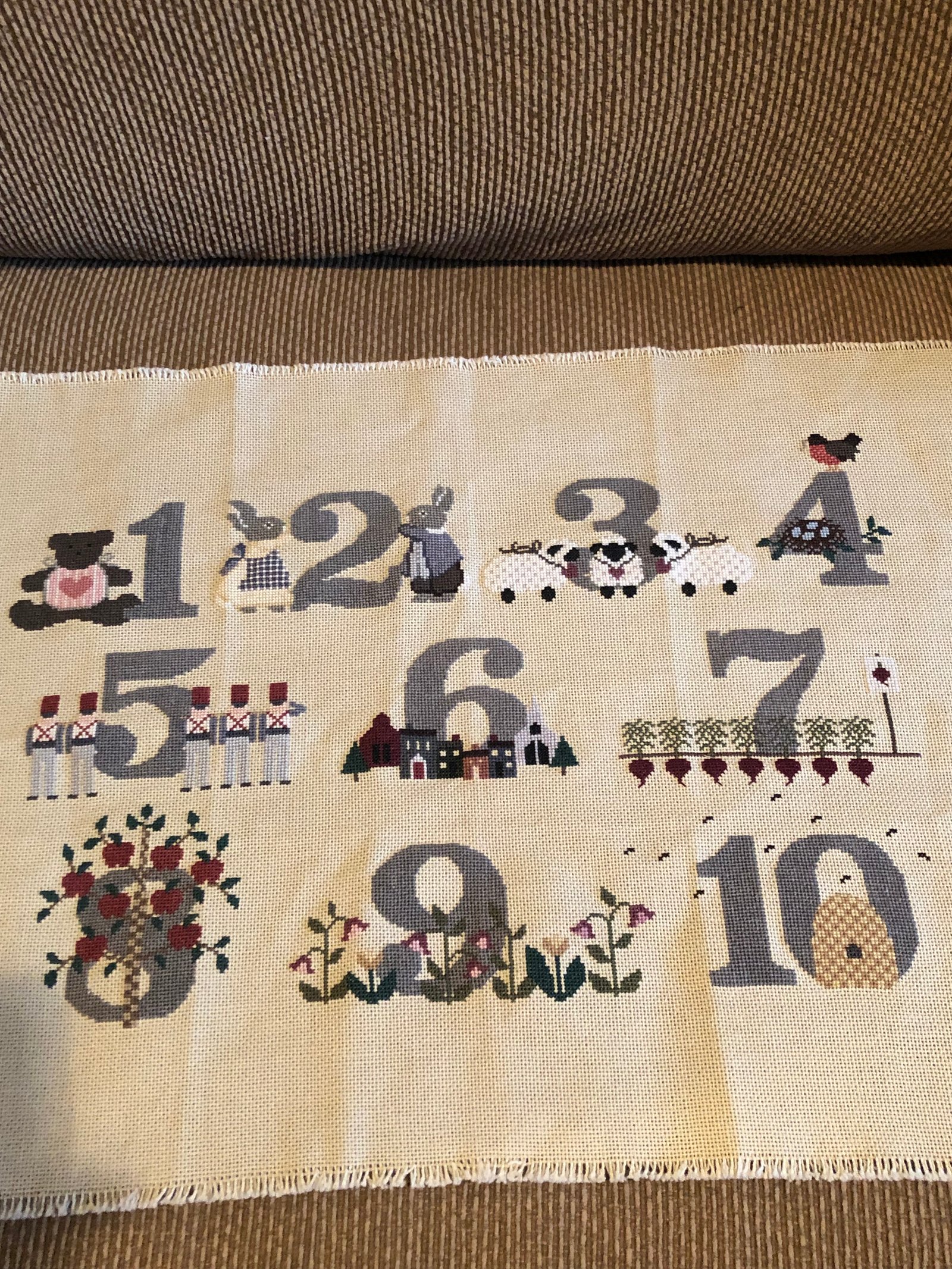 Now to the fool part...Three weeks go by and I receive a small package in the mail...it's a panel much like the one above but with numbers. There was a card with the piece but no return address on the envelope. The card said, "Hi Nan - I might know who stitched the alphabet your friend purchased at Value Village. LOL!!" I didn't think the card was signed because I couldn't make out a name - I thought it was a "doodle!" Also, I thought, because I'm sarcastic and think everything is a joke, that the card implied it was NOT hand-stitched - especially because of the LOL!!! I picked up the piece and turned it over and grabbed my glasses and then added another pair on top of them. I studied it over and over and decided that it HAD to be machine made because it was PERFECT. I assumed it was a purchased panel - and had a nice little smirk...because what are the odds that Denise buys a hand-stitched piece and then one of my blog readers sends me a matching piece?!? I mean, WHO would ever give away TWO works of art? Pieces so beautiful that obviously took a great deal of time and work!??? This is what I received: