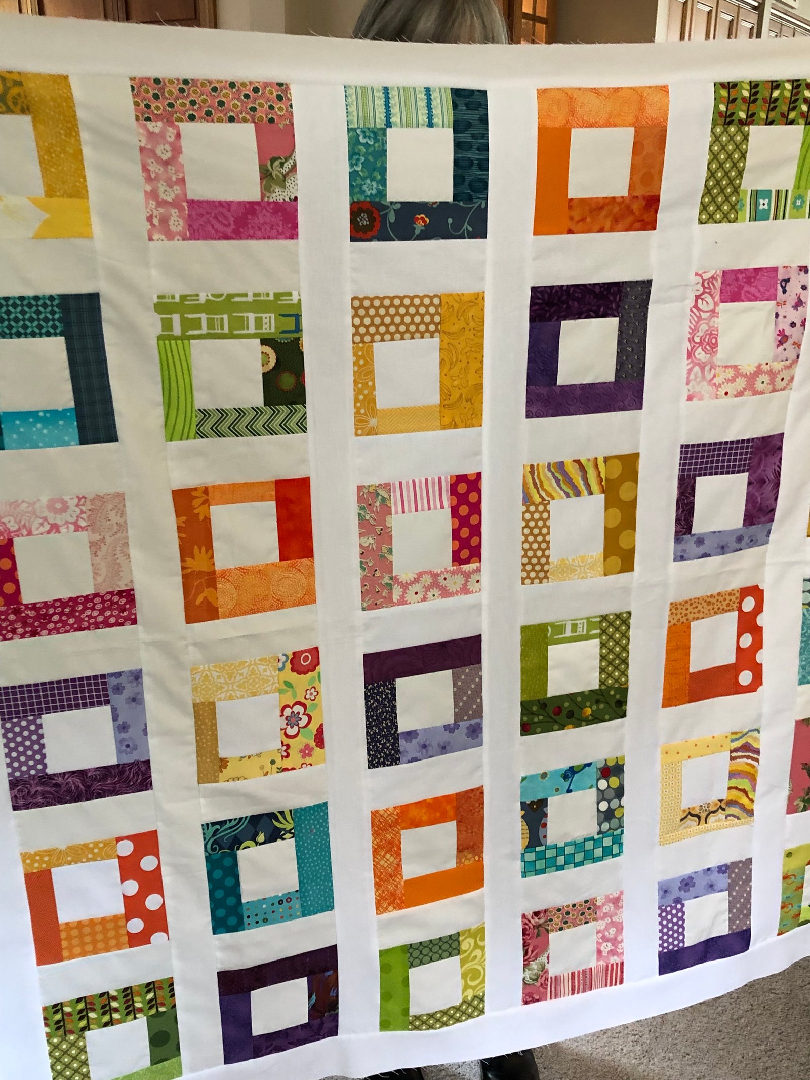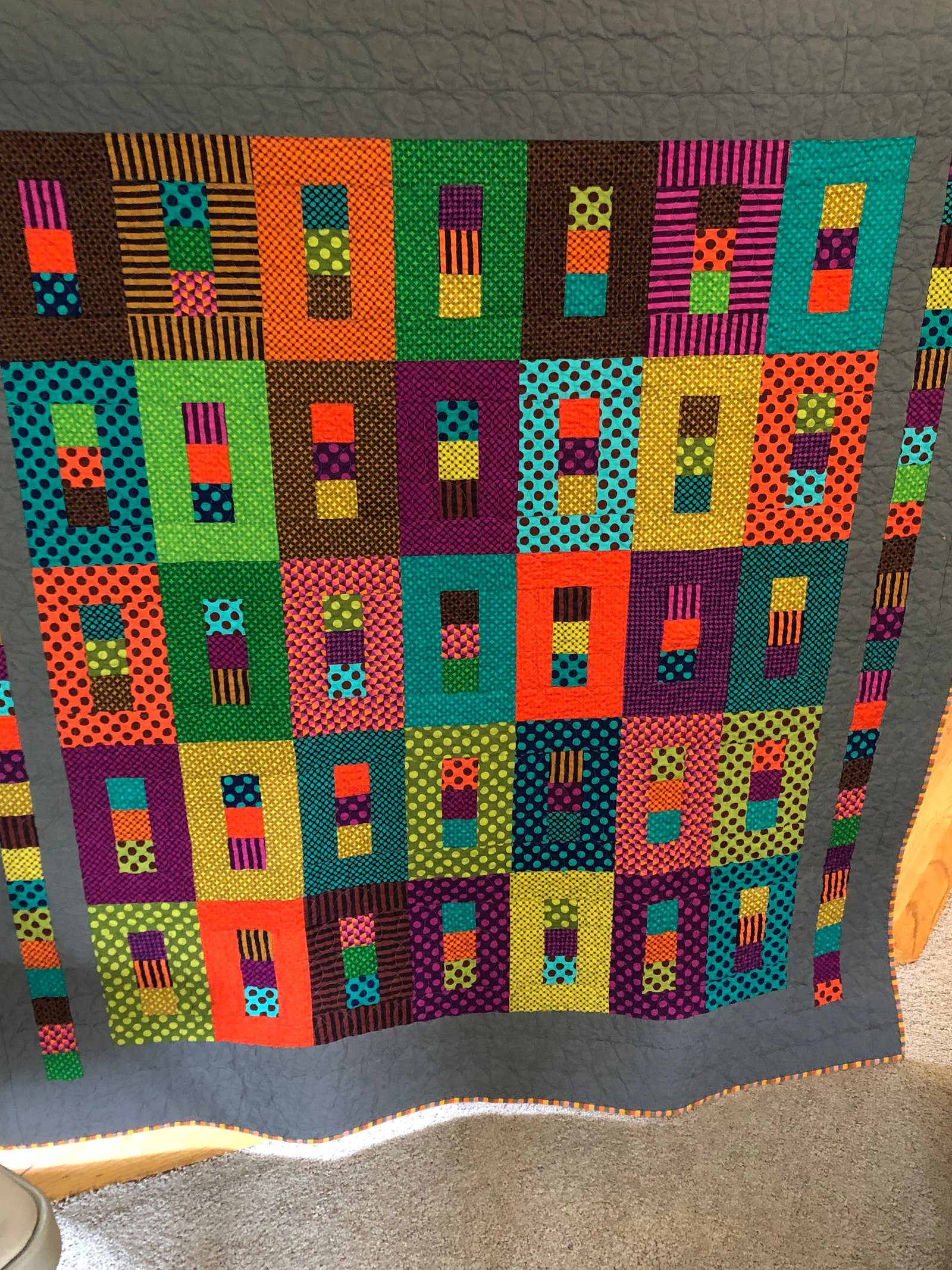 Stephanie's quilt was quilted by Terry - very cool quilting, can you see the loops and circles? The binding is pretty fun, too. Stephanie is another one who has an eye for color, pattern and fun...and she used gray as a neutral here, too! By the way, gray is the 2019 color of the year for nail polish! I'm always in the know for things that don't matter!
