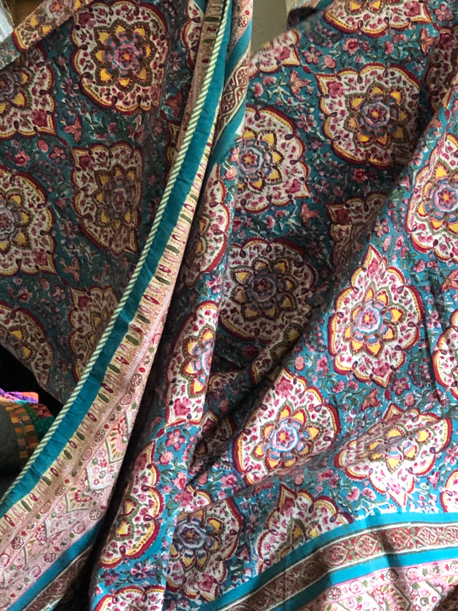 Marsha's daughter lives in Qatar and she sent this piece of fabric to her and asked her to either make her a quilt with it or to quilt the fabric - not sure which. What's unusual about this fabric is it already has a binding on it. And it is also very thin, was made in India, which is where her daughter bought it, and we thought maybe it's a tablecloth? It's very pretty and whatever Marsha decides to make for her daughter will be wonderful.