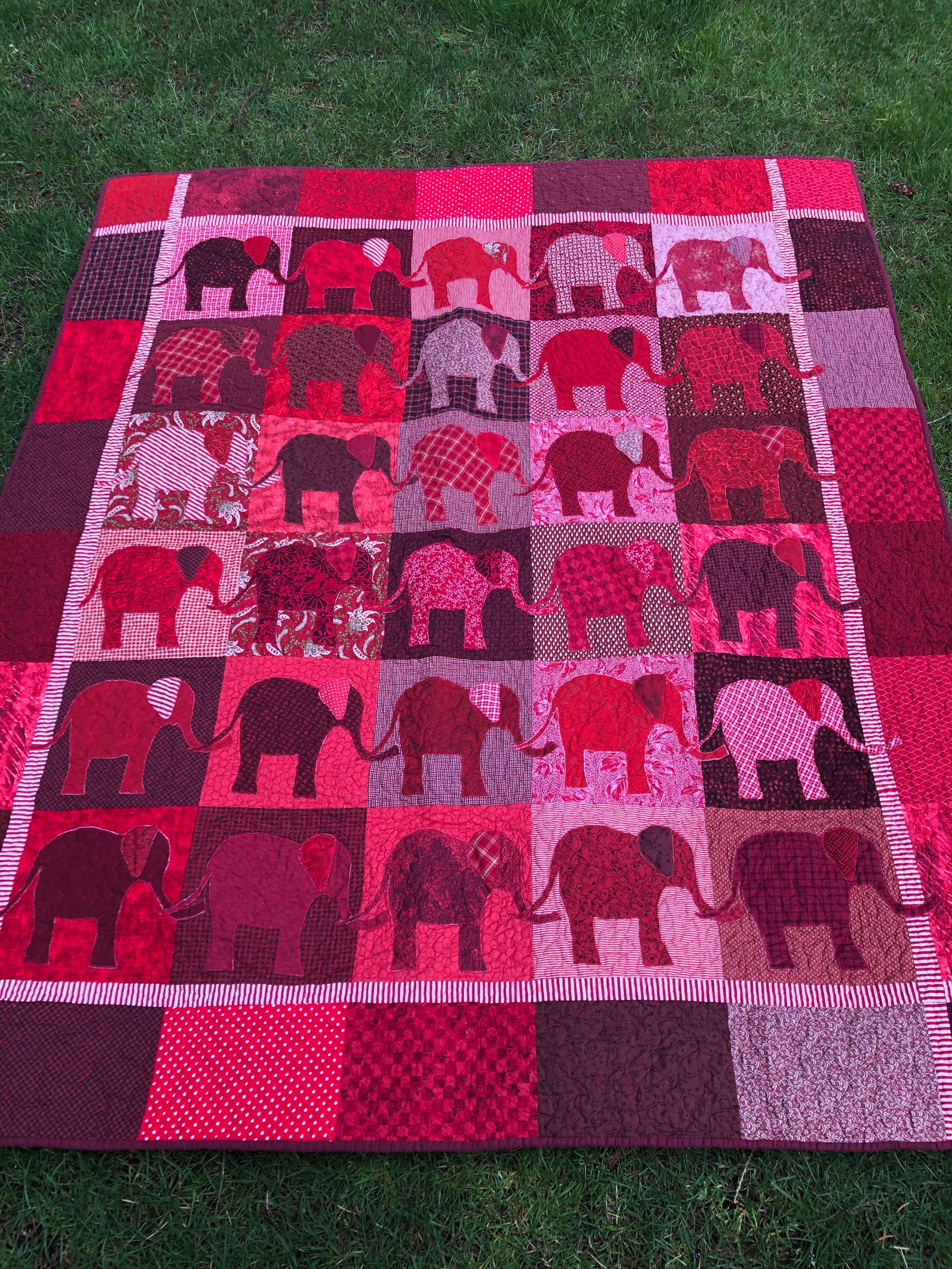 The trunks overlapped the border on one side and the tails on the other. The elephants are all machine blanket-stitched, and I used an iron-on, very light-weight fusible underneath each elephant; this quilt is very soft. I love it so very much. It's now my "go-to-quilt" when it's time to plop down in front of the boob tube.