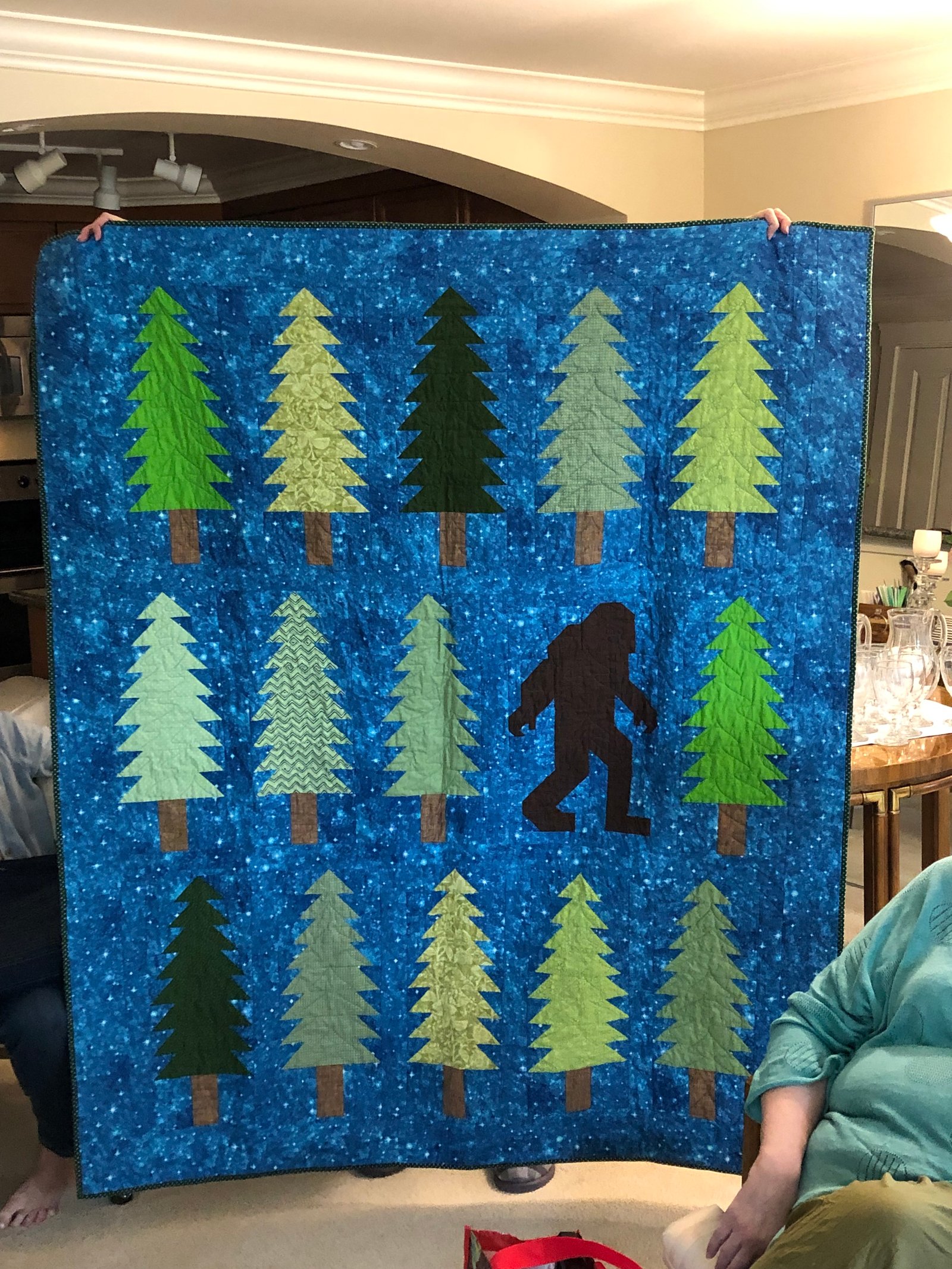 We hadn't seen Kareena for a while so it was great that she hosted us and even better that she had a stack of quilts to show (I failed to get pictures of all of them - so sad about that!) This Sasquatch quilt has been on my "to make" list for quite some time...I need to get it done before my grandson Max grows up! He and I still go Sasquatch hunting in the forest (our neighborhood park) and I'm not sure how long we'll be able to do that before he realizes his grandma is nuts.