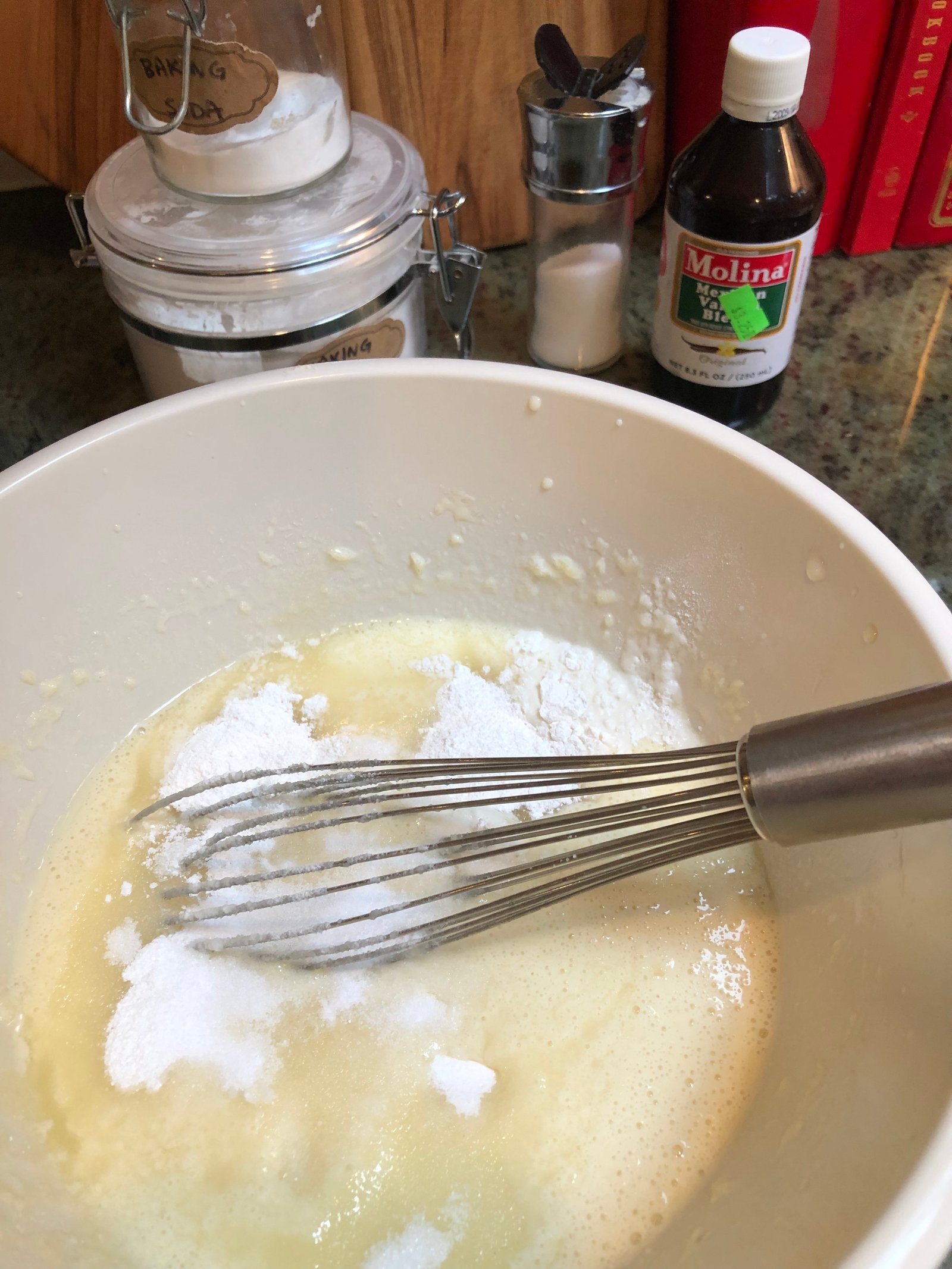 Since these pancakes are baked on a sheet-pan, you get one giant pancake so everyone at your breakfast (or dinner!) table can eat hot pancakes at same time! Genius! And delicious! And the only possible negative comment you might hear is, "But I like my pancakes round, not square," and I'll give you one guess who said that?!? The mister is such a creature of habit! But he ate square pancakes and loved them! If you really wanted round pancakes, or star-shaped or heart shaped or whatever, use a cookie cutter and cut them out in any shape you want. Again, it's genius! So let's talk about the recipe...you start with eggs, buttermilk and butter, the three building blocks for a great pancake!