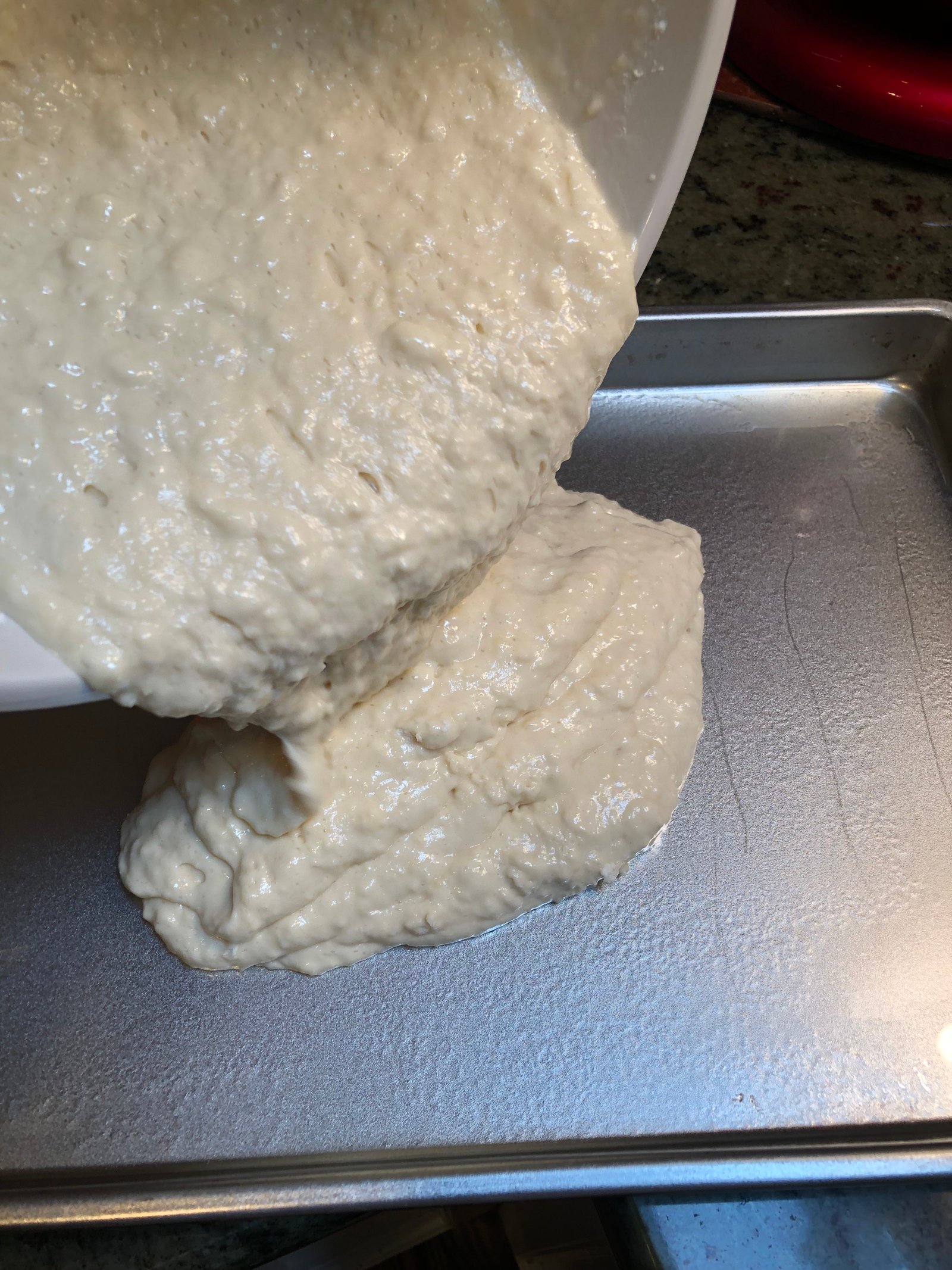 Scrape the batter into the prepared baking sheet, smoothing into an even layer with a spatula. Bake until the pancake is lightly golden and springs back in the center when poked, 11 to 13 minutes. Remove from oven and heat the broiler to high. Brush the remaining 2 tablespoons melted butter onto the pancake. Broil until golden brown, 1 to 2 minutes, rotating halfway through. Cut into 12 slices and serve warm. Serve with your favorite syrup, heated, of course!