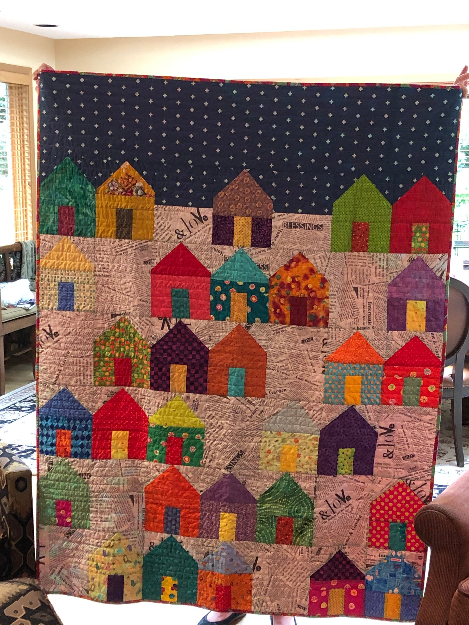 Barbara's house quilt - there is just so much to love about this. Like her background fabric with words - very clever! And her dark sky at the top - it's perfect and of course even more baffling to me, it lines up perfectly straight! That never happens in my quilting world! I love the happy, colorful houses...this was a group project, too. We all made house blocks for each other. Mine are still in the "aging process" and when they are ready (when I'm sick of seeing them stacked in my to-do pile) then they will be sewn together into a quilt just like this...at least that's my hope!