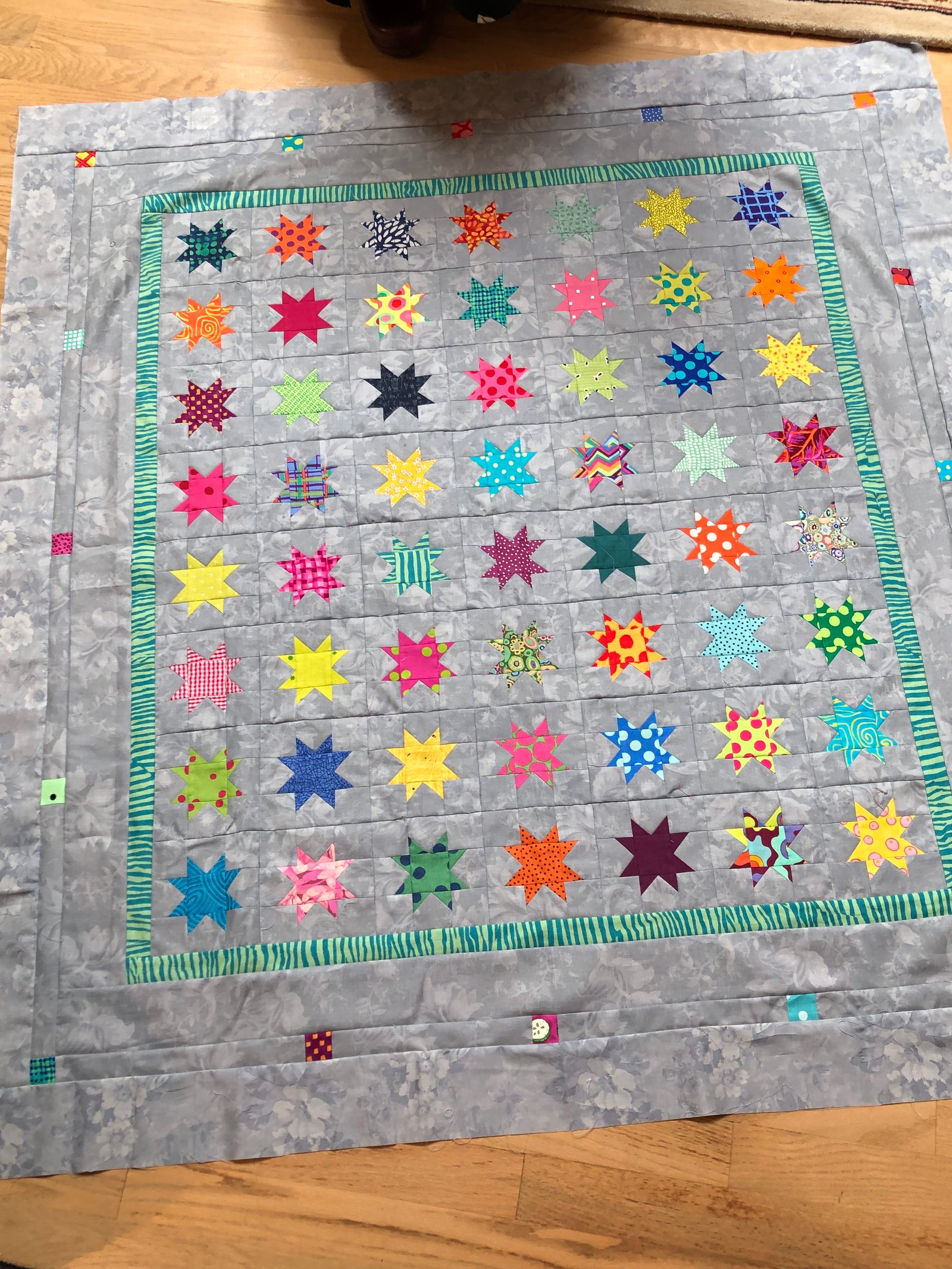 Helen whipped up this little beauty. I love her pieced border, little gray squares floating along...Helen said she actually did the math so everything would be spaced evenly...I may have let out a gasp. Helen is infamous for saying, "We don't DO math!" and then she goes and does it. Where is the real Helen? What have you done with her?!