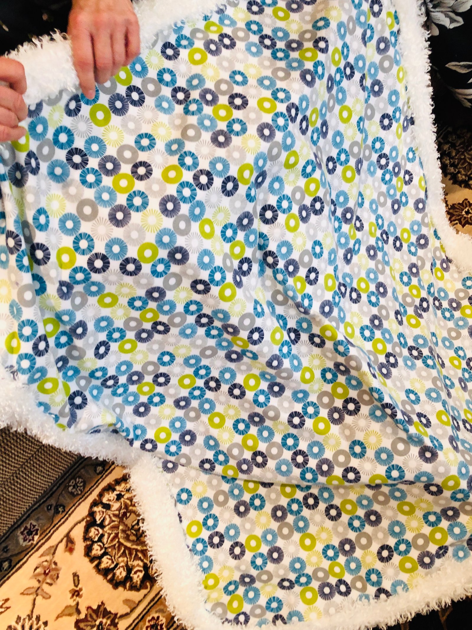 If you are going to make a baby gift any time soon, this is the gift to make! Janet made this - swears it's easy - said it's sewn like a pillow case and you buy that fluffy, soft trim and sew it on. This was so soft and cuddly, I would love one just for me!