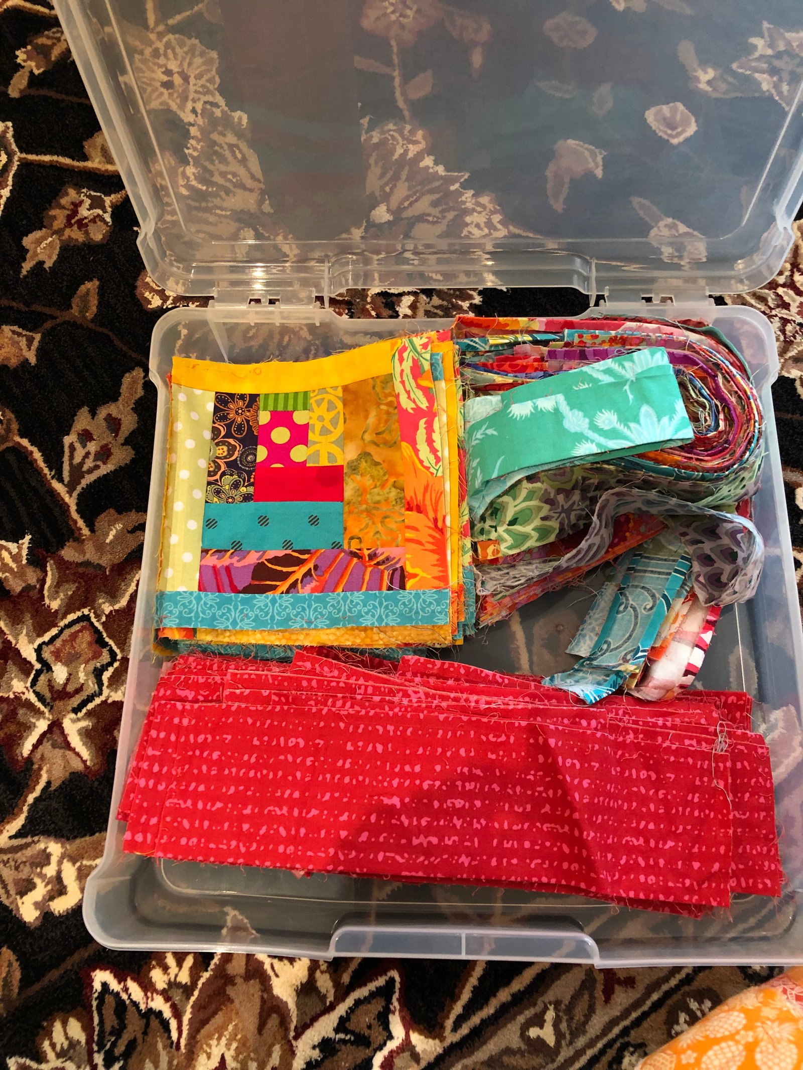 This would be torture for me...Stephanie sewed a bunch of scraps together into blocks and then sewed the blocks into a quilt...the blocks are pictured above...and they are now blocks again because she TOOK the quilt APART!! Those blocks are now on their way to being scraps again!!! What the %&%$?!?!?!?!? My brain hurts just thinking about that! Stephanie is an artiste...I get that...but isn't there some fine line between art and madness?!?!? I fear she may have crossed it! And I will happily eat those words when she RE-sews all of those pieces into something even more fabulous! Oh...one more thing...the scraps now have a "stitching line/fold" that she plans to PRESS out...oh my aching cerebellum...RE-PRESSING seams!!! That is just toooooo much! I laugh just thinking about it. And then I reach for the Advil.