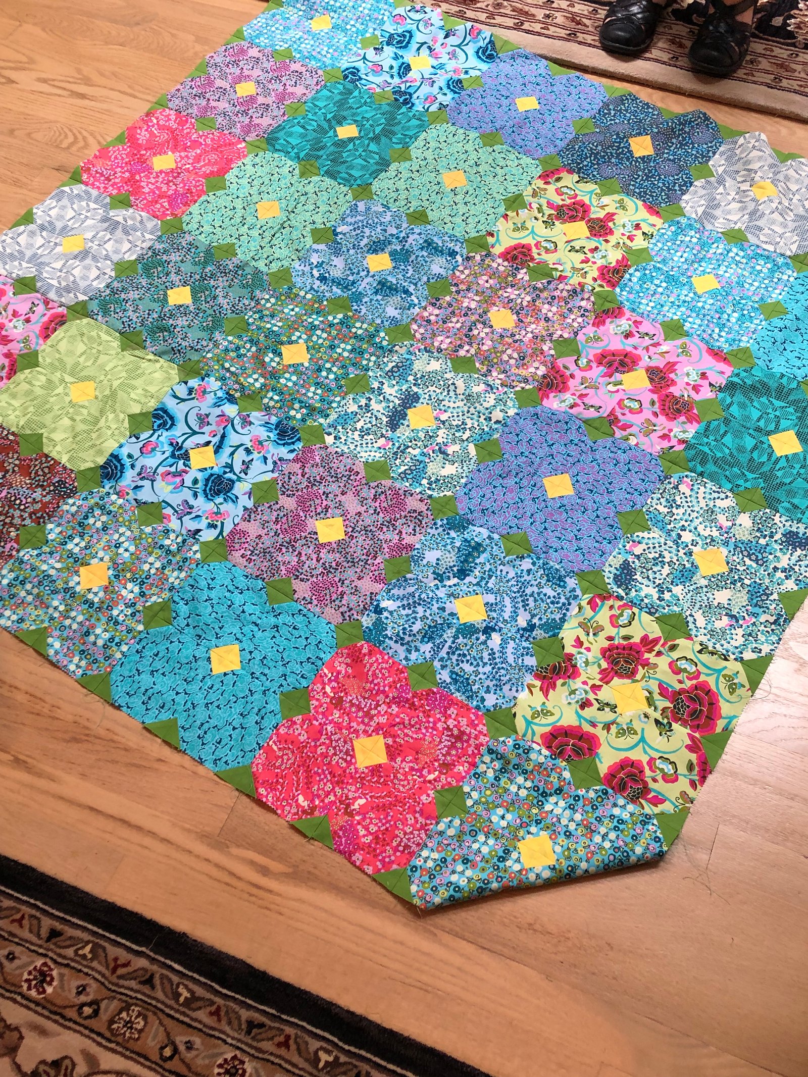 Summer has yet to arrive in the great Northwest, it's still cloudy, cold and drizzly. I'm not sure what Mother Nature is thinking, summer usually shows up July 5th, and I was counting on seeing the sun, at least my tomatoes were! I have two tomato plants, one is loaded with tomatoes, the other is trying, which is a first for me and my tomato-growing-attempts. I'm almost giddy with the thought that I could actually pick a ripe tomato before Halloween! While the sun ain't shinin' there is still much quilting to do, at least the cooler temps are good for that!