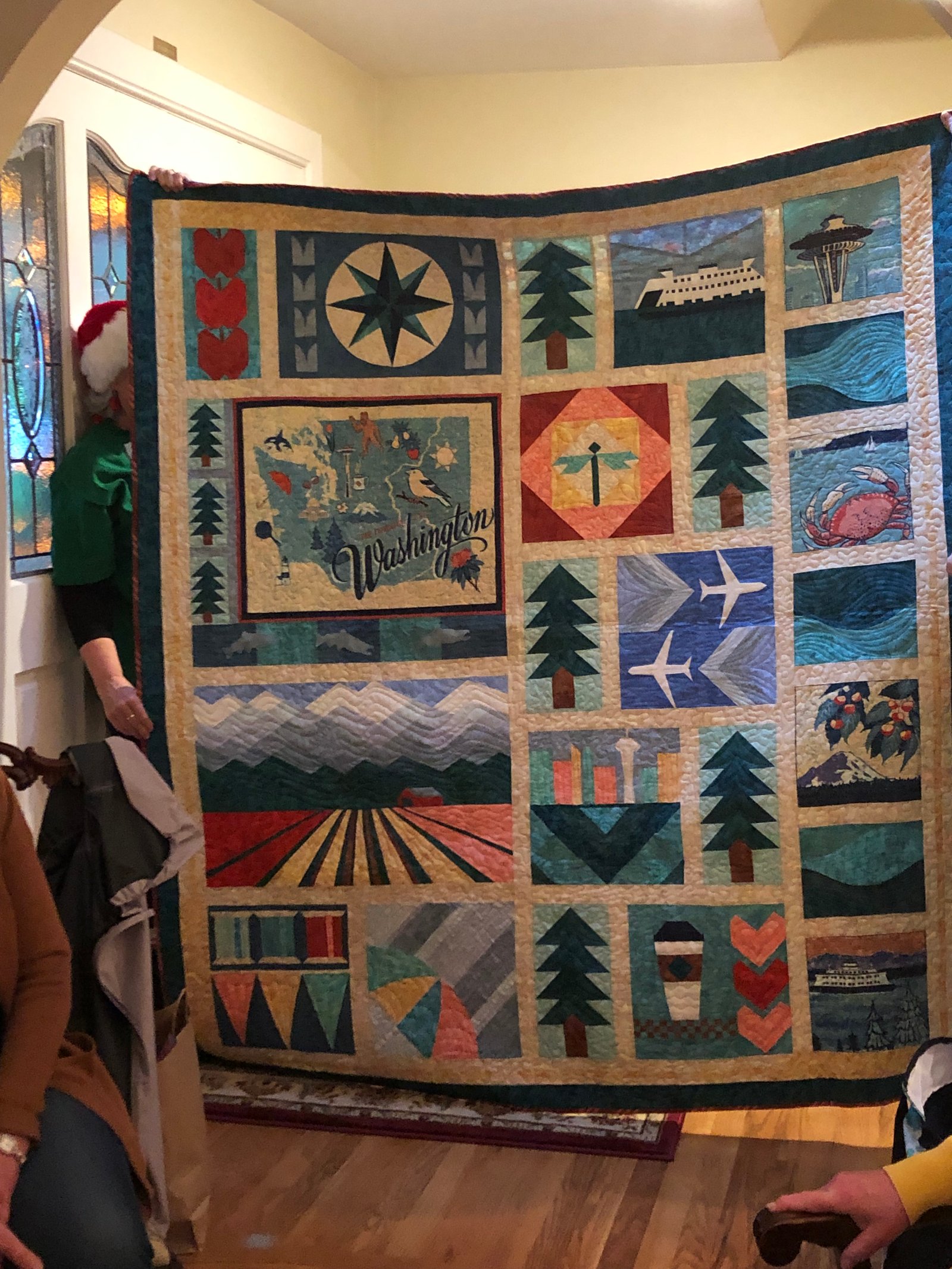 Jenny brought the three quilts that will be on display at the Block Party Quilt Show this coming weekend. The show runs from November 8th to the 10th and is at the Issaquah Community Center. If you go to the show, and I hope you do, please vote for one (or ALL!) of Jenny's quilts...they are all beautiful but I am partial to her State Flower Quilt which is just amazing in person!