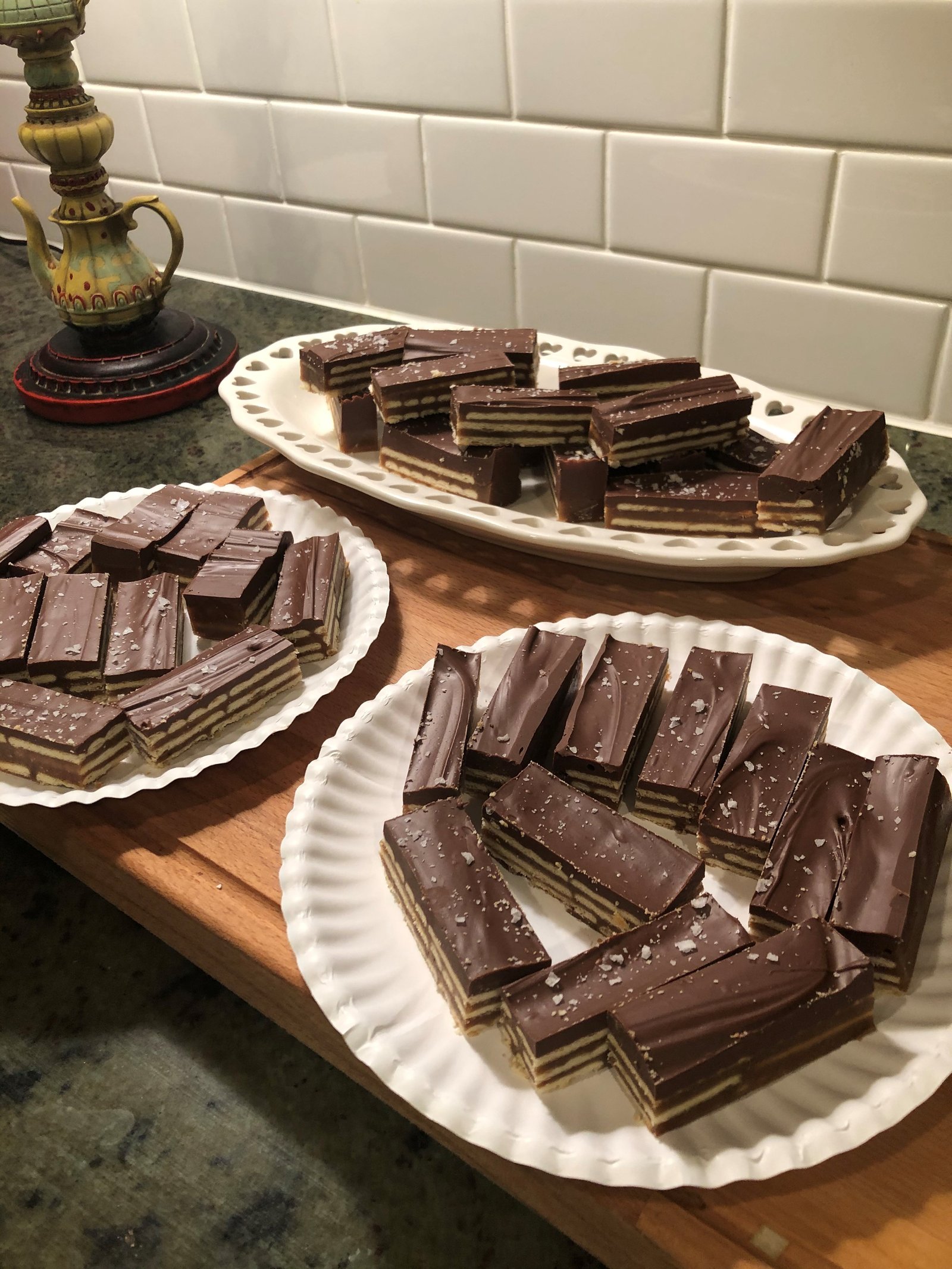 Chill for an hour before cutting. Using the edges of the parchment paper, lift the entire thing out of the pan to a cutting surface. Using a sharp knife, cut into bars. These are very rich so don't cut them too big! I cut my bars along the lines of the crackers, about 2 1/2-inches by 1-inch. Makes about 36 bars, depending on how big you cut them.