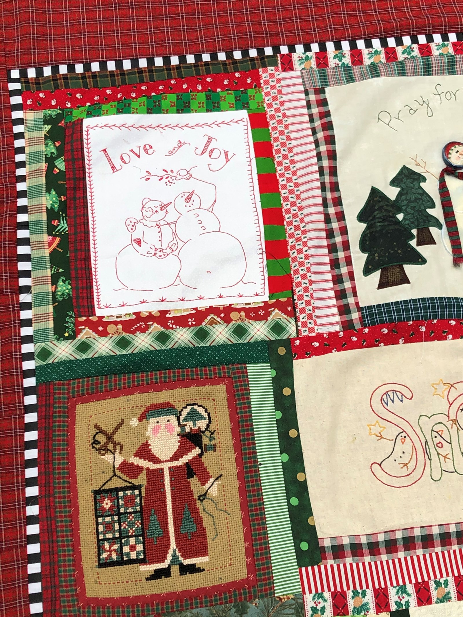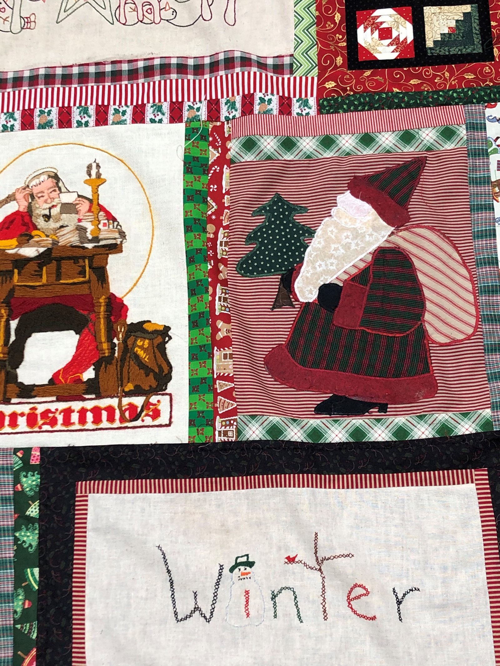 Mari made the top left Santa - it was a beautiful quilted pillow and I left the quilting on so it's a bit thicker than the other blocks but I love it. Michelle, I think, made the little cross-stitch Santa in the bottom left corner and Denise made those miniature flying-geese borders...all paper pieced and the paper was still on because those borders were part of a framed picture that broke as I was trying to stuff everything into the closet...that's what really started this project...a broken picture, a few tears, a pile of things I loved that just needed a new way to be. I made the two blocks on the right, top and bottom. The bottom green Santa was from a Christmas stocking that had my name on it; it was part of the family set but then I decided we needed new stockings so I stuffed my stocking and used it as a pillow on the guest room bed for many years.