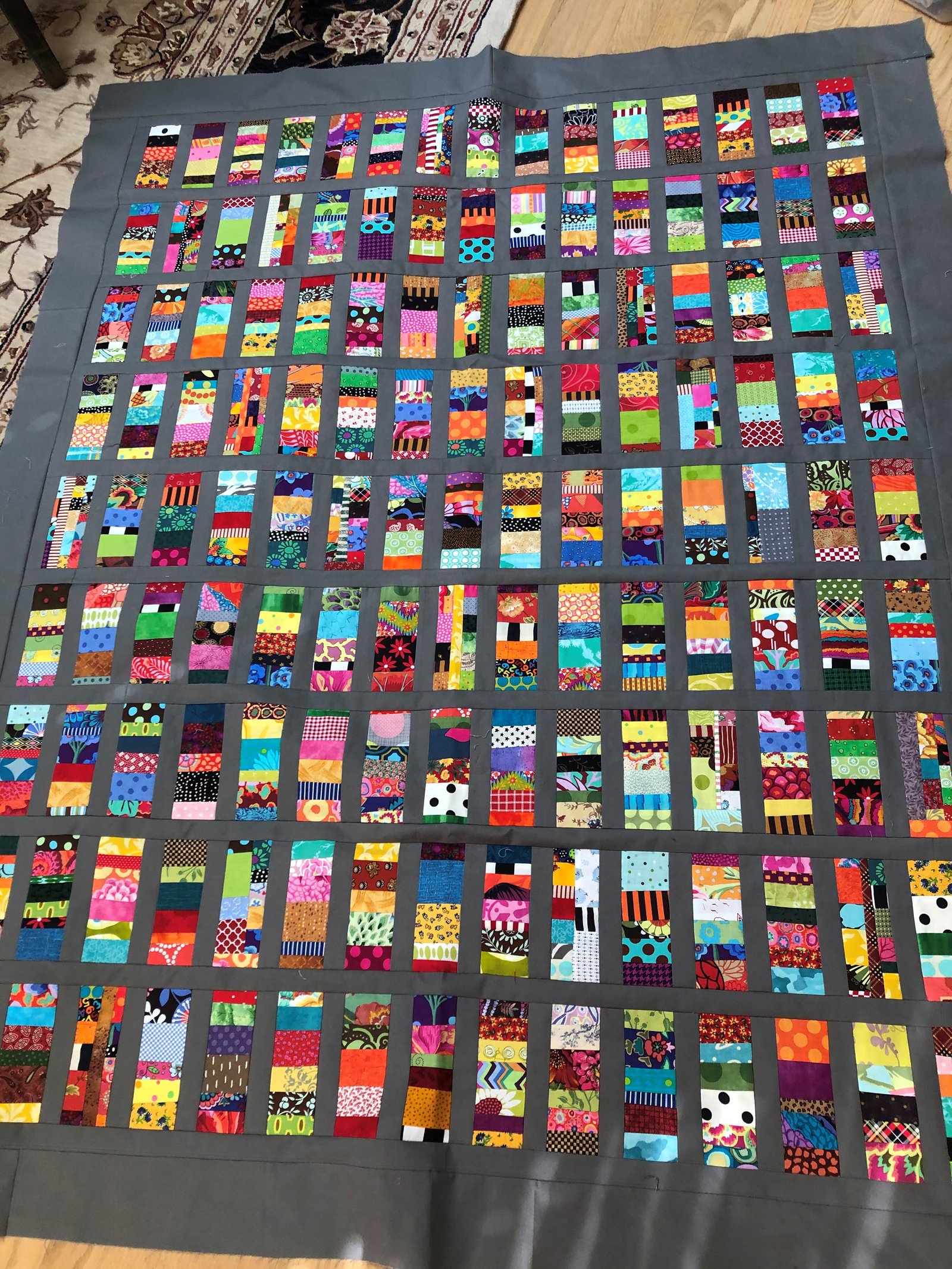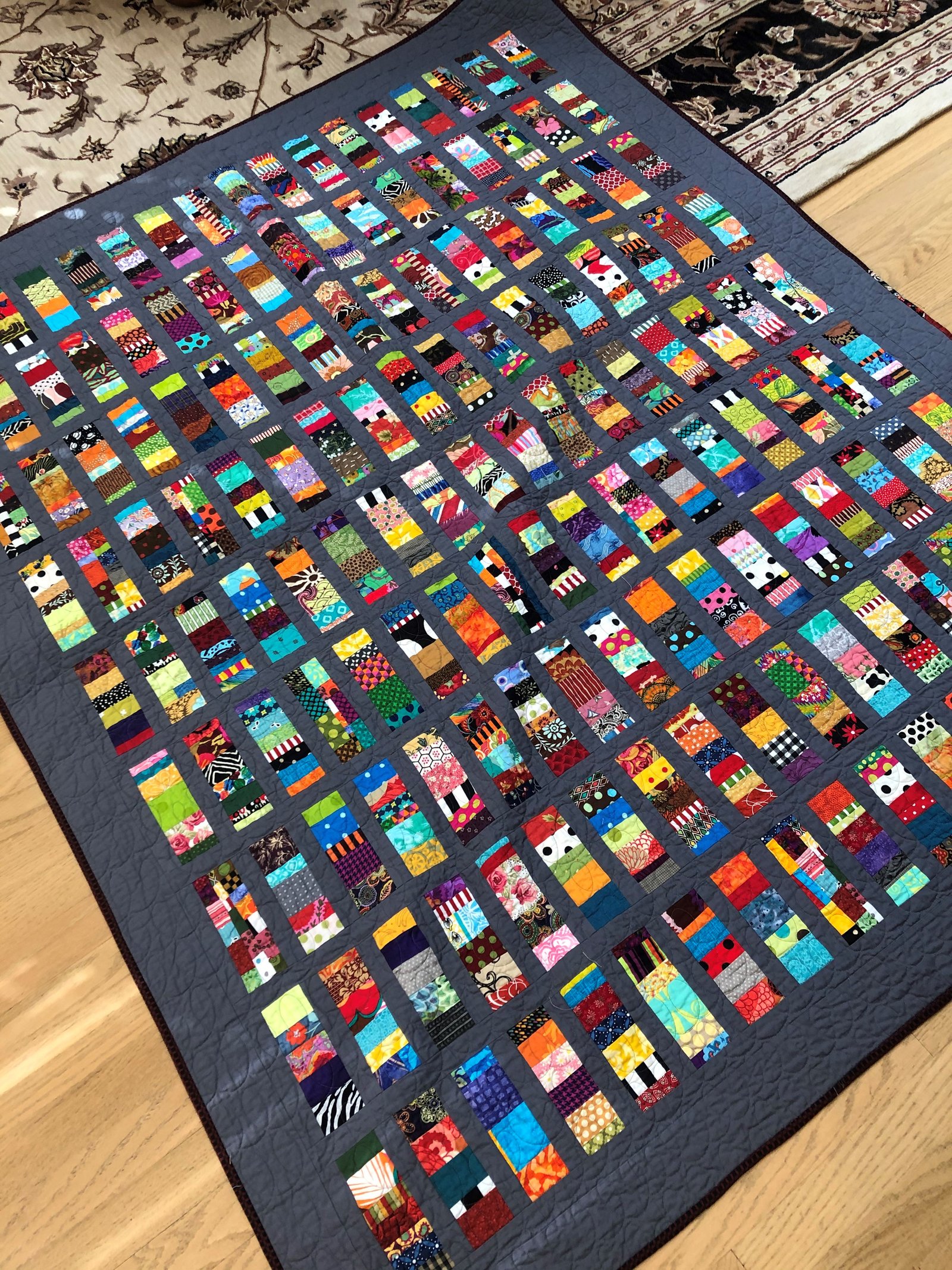 I'm going to mangle this story but basically I think it goes like this...Stephanie was asked to make a quilt - she showed the person the above quilt and they loved it. It's made entirely with scraps and some of those tiny pieces were definitely trash-can-worthy but not for Stephanie! Notice the border/sashing fabric is a blue-ish-gray...the quilt below is the one Stephanie just made for the person and the border/sashing fabric is a lighter gray.