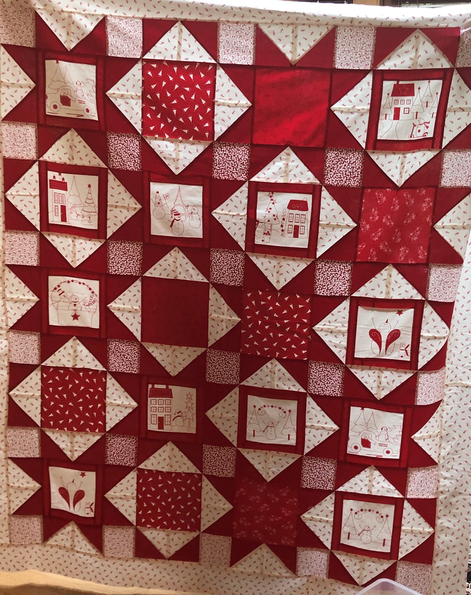 Helen finished hand-quilting this Christmas wall-hanging...she said she was able to work on it, even while being on drugs from a knee replacement...all I can say is we should all be taking those drugs because look how perfect this is!! I've been hand-quilting a quilt for the last three months, every night in front of the telly and my titches are no where near as small or as straight as Helen's...seriously, pass the Oxy, my hand-quilting could use some help!