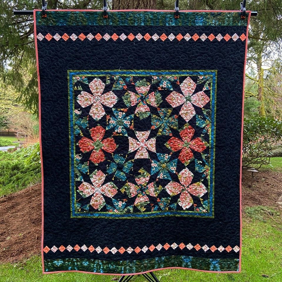 The above quilt was made by Jenny for a very special friend. I took a picture of this quilt at our meeting but it turned out all blurry - shock! I found this picture Jenny had posted on FB, so I stole it so I could show you her stunning quilt. Aside from being a very cool quilt, this quilt started somewhere else besides Jenny's work room...Jenny bought the center piece of this quilt at a quilt show boutique! Then she added to it making it the fabulous quilt it is now - I hope you can click on this picture to see the quilting, it's pretty incredible. Jenny even "ice-dyed" the green-blue pieces of fabrics she added to this quilt. The binding is perfect and everything just came together and works so nicely. I know her friend will love this quilt, probably not as much as she loves Jenny but close!