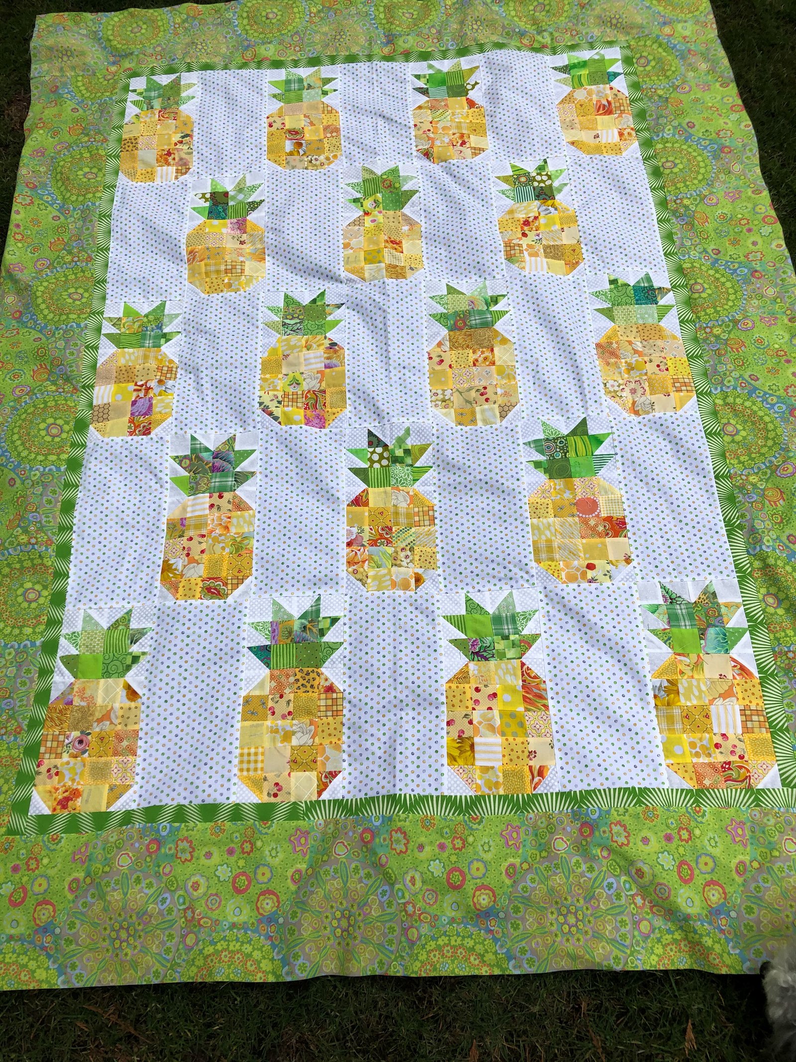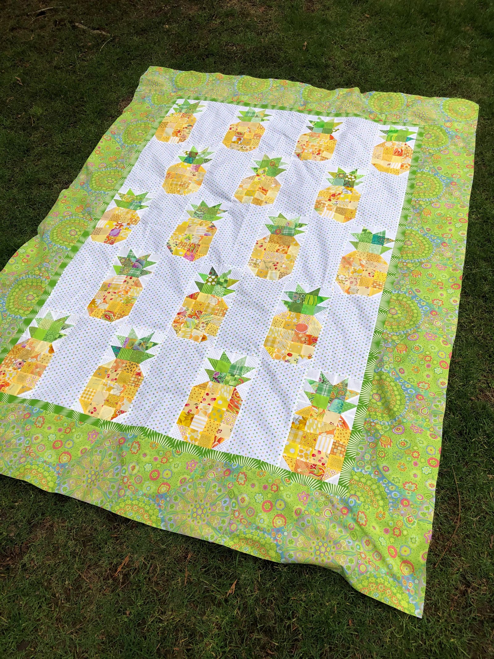 Corona quilt #2 is a beaut, no? I started this quilt last July when we were toying with the idea of going to Hawaii the week before Thanksgiving so the mister could watch his beloved basketball teams in the tournament that is held there every year. The mister was desperately trying to finagle a way to make the trip work...he wanted to see the games but I wanted to be home in time to shop and prepare for Thanksgiving...I won. Which meant no Hawaii for me which was sad but I was so happy to be home for my favorite holiday and my parents were able to be here, too! My pineapple quilt soon became a way for me to assuage my sadness of saying Aloha to Hawaii.