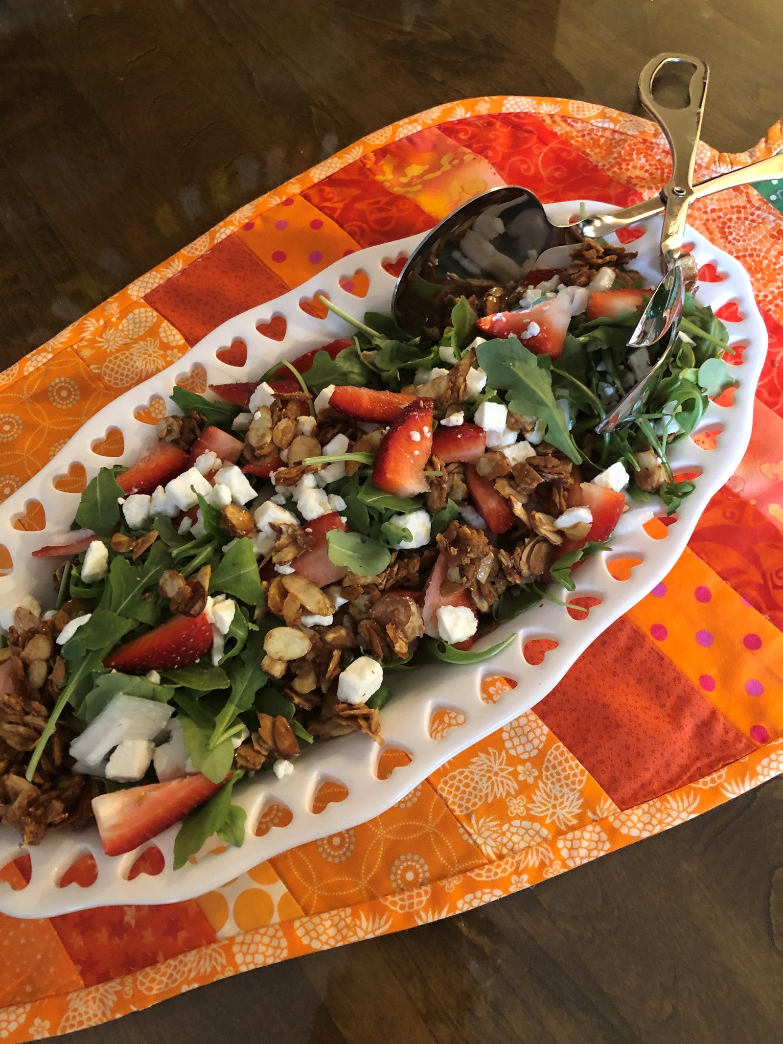 Strawberries are a sure sign of spring and their sweetness adds the perfect balance to the slight bitterness of the arugula. Of course, candied almonds help with that, too. This salad is very adaptable, if you don't want to use strawberries, use chopped apples. If you don't want to use feta cheese, use crumbled blue cheese. If you don't want to use candied almonds use candied pecans - but whatever you do, don't mess with the dressing, it's divine.