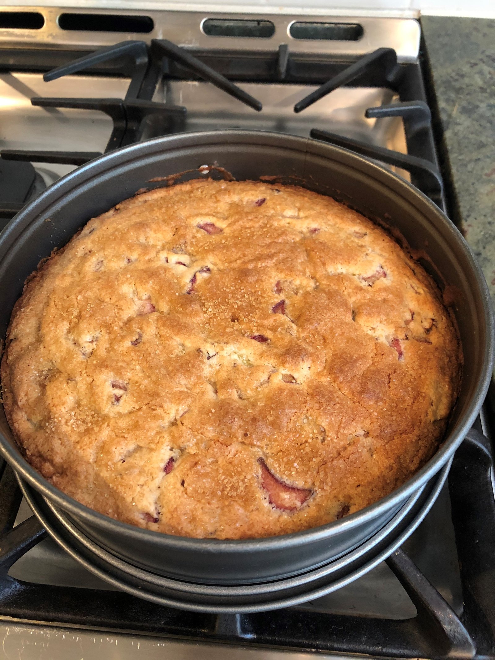 Spread batter into the prepared pan and sprinkle the top with 1 to 2 tablespoons of turbinado sugar. Bake for about 40 to 45 minutes, or until the cake is a golden brown and a toothpick inserted into the center comes out clean. Let cake cool for about 15 minutes before running a knife around the side of the pan and releasing the pan. Let cake cool completely before cutting (but if you must dive in, go ahead, I can never wait!) Makes one 9-inch cake, serves 12.