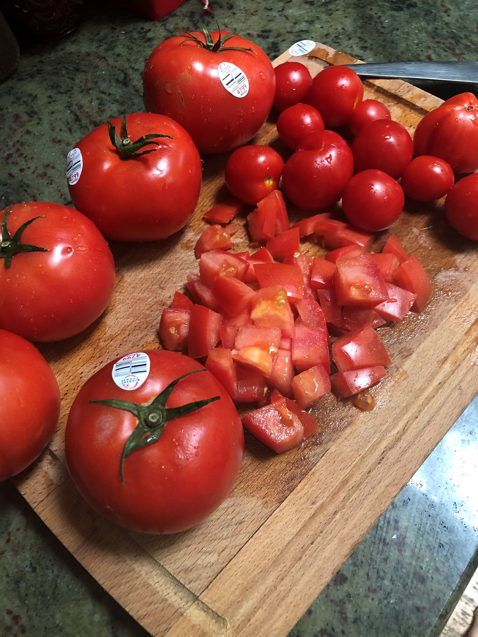 Try to find the best tomatoes, from a farm stand if you can because they do taste so much better than those in grocery stores. Fresh herbs are key here, too; basil and parsley which I happen to be able to grow (!) but you can add whatever herbs you want, this is also great with rosemary and/or oregano, too. If you want to get really carried away chop up some fresh zucchini or fennel!