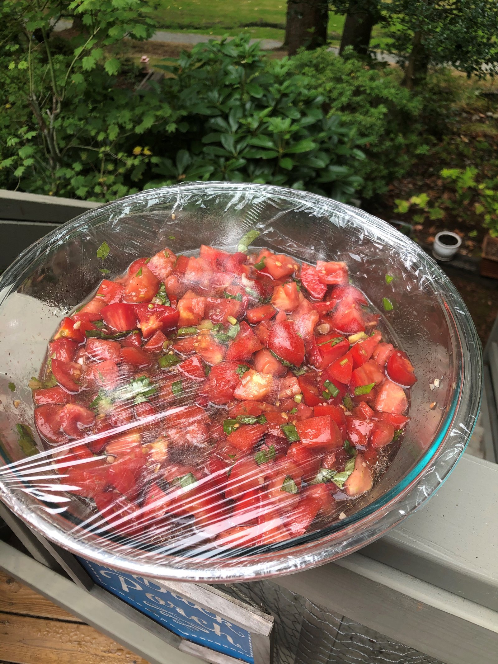 After everything is mixed in one big bowl, cover it with plastic and let it sit in the sun for 4 to 5 hours to marinate. I swear the sun works some kind of tomato-magic, you will be amazed! What to do if you don't have sun? This still works on a cloudy day as the ultra-violet rays still go through clouds but it does not work if you have smoke-filled skies like we've had in Seattle for the last few days. So wait until the sun shines to make this! We are hoping we'll get some rain or wind to blow this smoke out of here soon, the experts say we have the 3rd worst air in the WORLD right now! If you're keeping track: Covid, quarantine, isolation, riots, murder hornets, hurricanes, election crap, fires, and now toxic air...did I miss anything?
