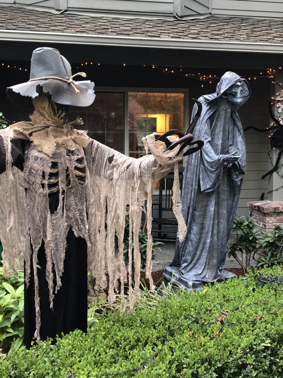 I won't bore you with all of the gory details but I do want to show you a few pics from our Halloween. The boy has gone off the deep end with this stuff but what can I say? I raised him! Halloween was always a big deal for my kids but somewhere along the way the boy took it to another level. No cute-sy, sweet scarecrows or Casper the Ghosts, he's all about the scare! Almost all of his creatures have motion sensors to when someone walks close to them they start waving their arms and talking - and for a good two hours Halloween night it seemed like they were all talking/screaming at once!