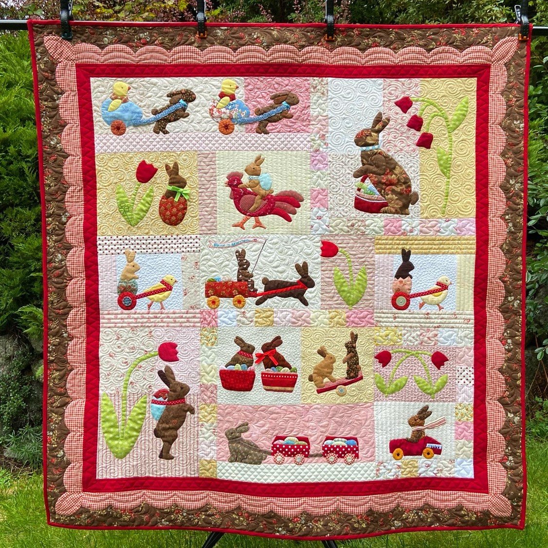 I posted pictures of this quilt before it was quilted, so it might look familiar. Terry quilted this and as you can see, the quilting is pure genius. Jenny added special touches to this quilt, like the banner the little bunny is holding that reads, "Brown Lives Matter." And I think the bottom right bunny car has 2020 on it, for her son's high school drive-by graduation. This quilt is embellished with hand-made and vintage buttons, it is absolutely beautiful. Way to go Jenny, oh, she's keeping this one!