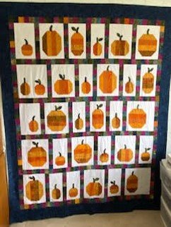 This is Mary's pumpkin quilt. I wasn't able to enlarge it but I think you can still see how wonderful it is! Love the pieced border and the different fabrics in each pumpkin. Mary's quilt are always a surprise, and usually large. She has such a good eye for colors, too.