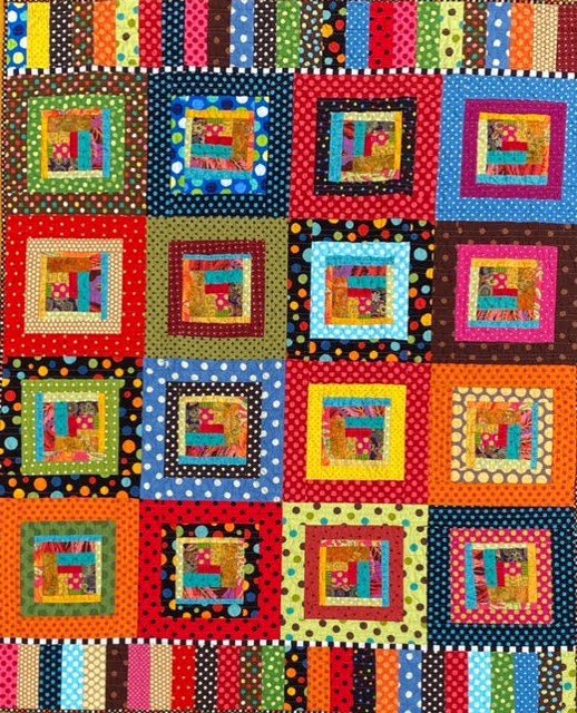 This is a quilt Stephanie made and gave to someone who donated to Obliteride this year. (Stephanie said they raised over $7,000 for Obliteride this year!!) Those fabric pieces in the center of each block were part of another quilt. Stephanie took that quilt apart (!!!) and added polka dot fabrics to them to make this fun and happy quilt. Again, so clever!