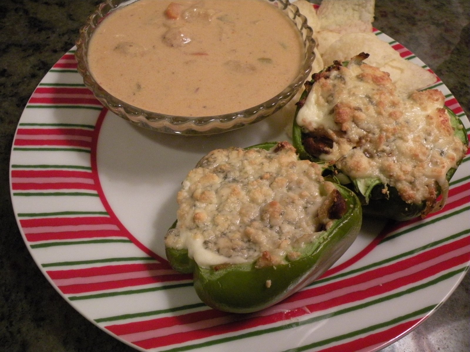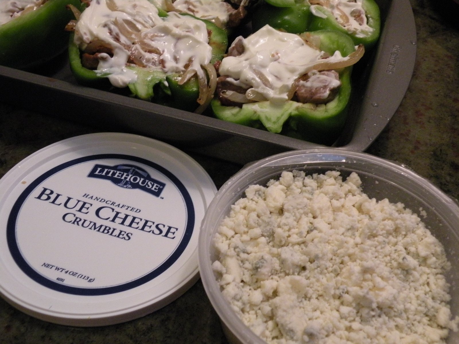 For round two, I took what Allan started and perfected my Buffalo Blue Cheesesteak Stuffed Peppers (said with great humilitly)...these are great for a football game (did you see the Seahawks KILL Arizona 58 to ZIP?!?), great for a snack, great for dinner in front of the tree with...surely you know...The Hallmark Christmas Movie of the Week!! (My sister ridiculed me over and over for watching them, whatever, I'm bullet proof when it comes to Hallmark movies!) Tabasco Sauce and Blue Cheese make merry with thinly sliced grilled steak, caramelized onions and sour cream...all tucked nicely into green pepper vessels...in a word? AyeCheeWaaWaa!
