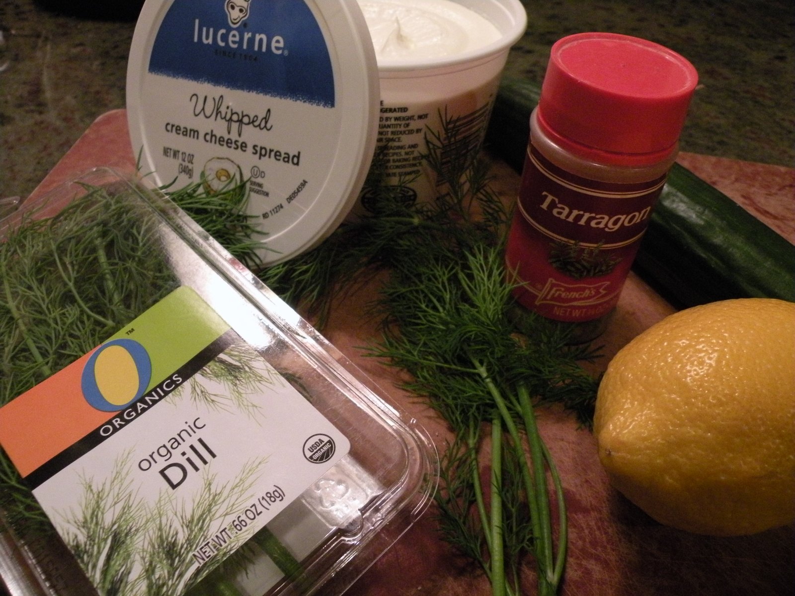 In a small bowl combine the whipped cream cheese, tarragon, lemon zest and black pepper. Using a small spoon or knife, spread about a teaspoon onto each of the cucumber rounds. Top the cream cheese mixture with a piece of salmon then place a small sprig of fresh dill on top of the salmon. Makes 16 appetizers, serves 4.