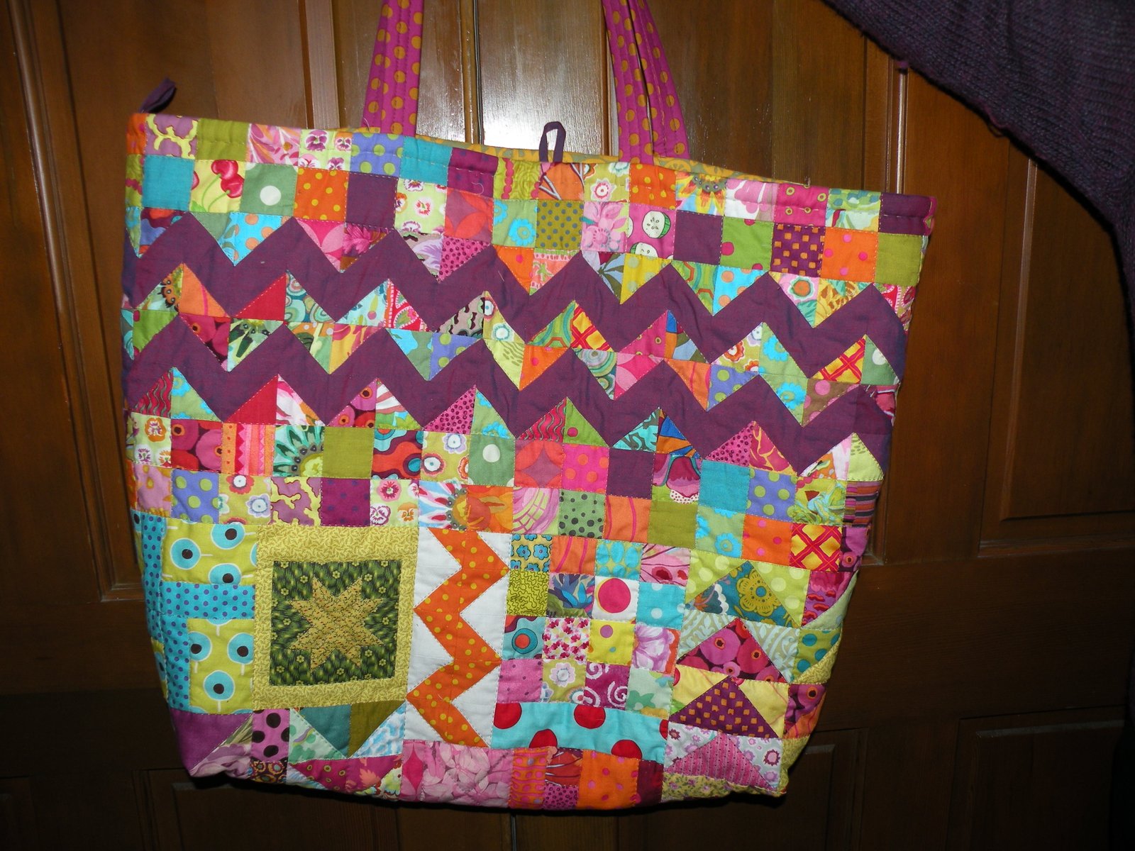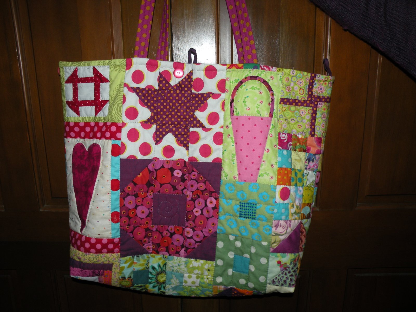 But we did have beautiful women and delicious food and fascinating conversation and jaw-dropping bags!! Our group is having a sew day where we are going to make ourselves some "quilt-toting bags". Helen brought in some of her bags for inspiration...the bag above was made with "orphan blocks"...I NEVER have orphan blocks lying around!! It's so bright and happy and we all loved it...but I don't think we'll have time to make this kind of bag at our sew day...maybe just in our dreams!